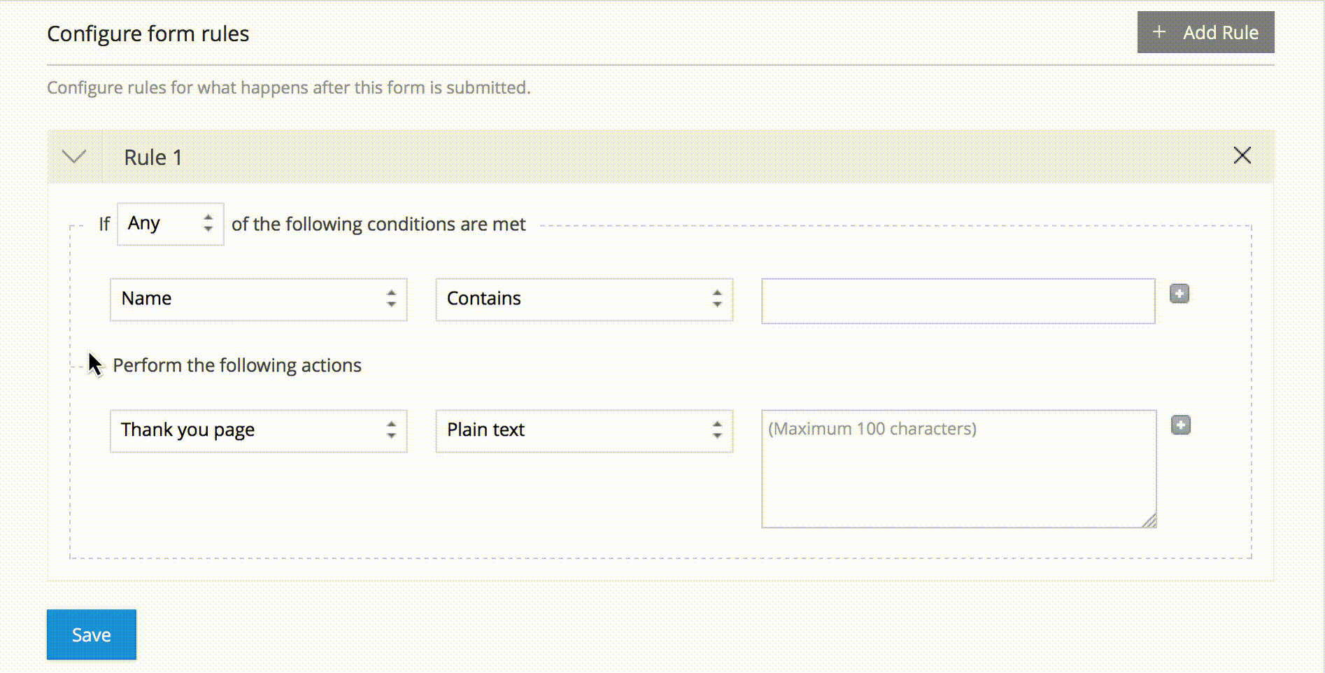 - Specify the condition to be met, and under actions, choose the Thank you page option. From the next drop-down, choose one of the options: Plain text, Rich text, and Redirect to website.