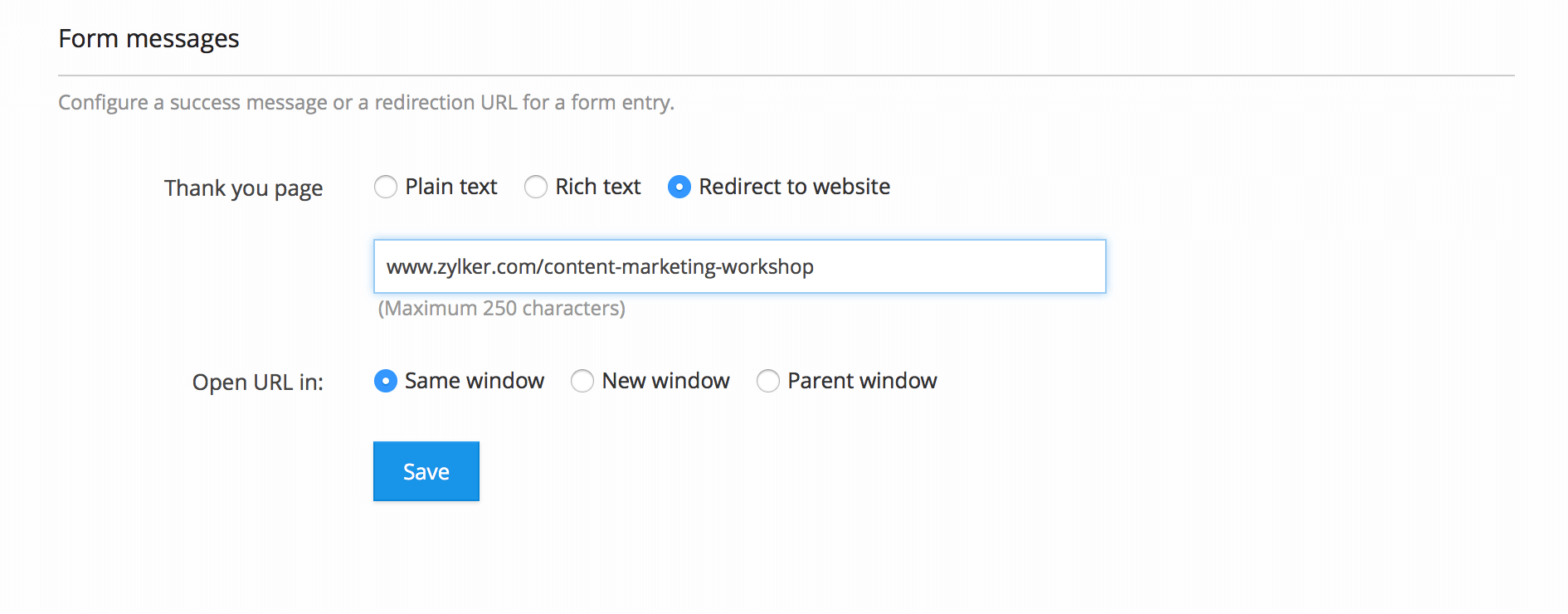 Parent Window: The URL opens up in place of the webpage in which you've embedded the form.