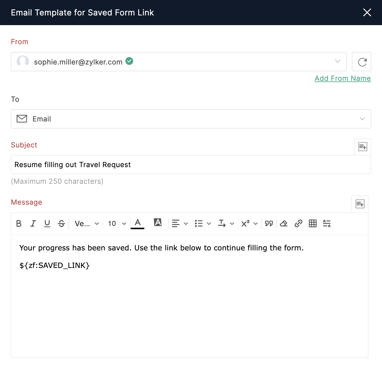Zoho Forms, your go-to online form generator puts an end to the frustration of your respondents with the Save and Resume feature. This feature allows users to save partially filled forms as drafts, close them, and return later using a link to pick up exactly where they left off; no lost work, no need to start over.