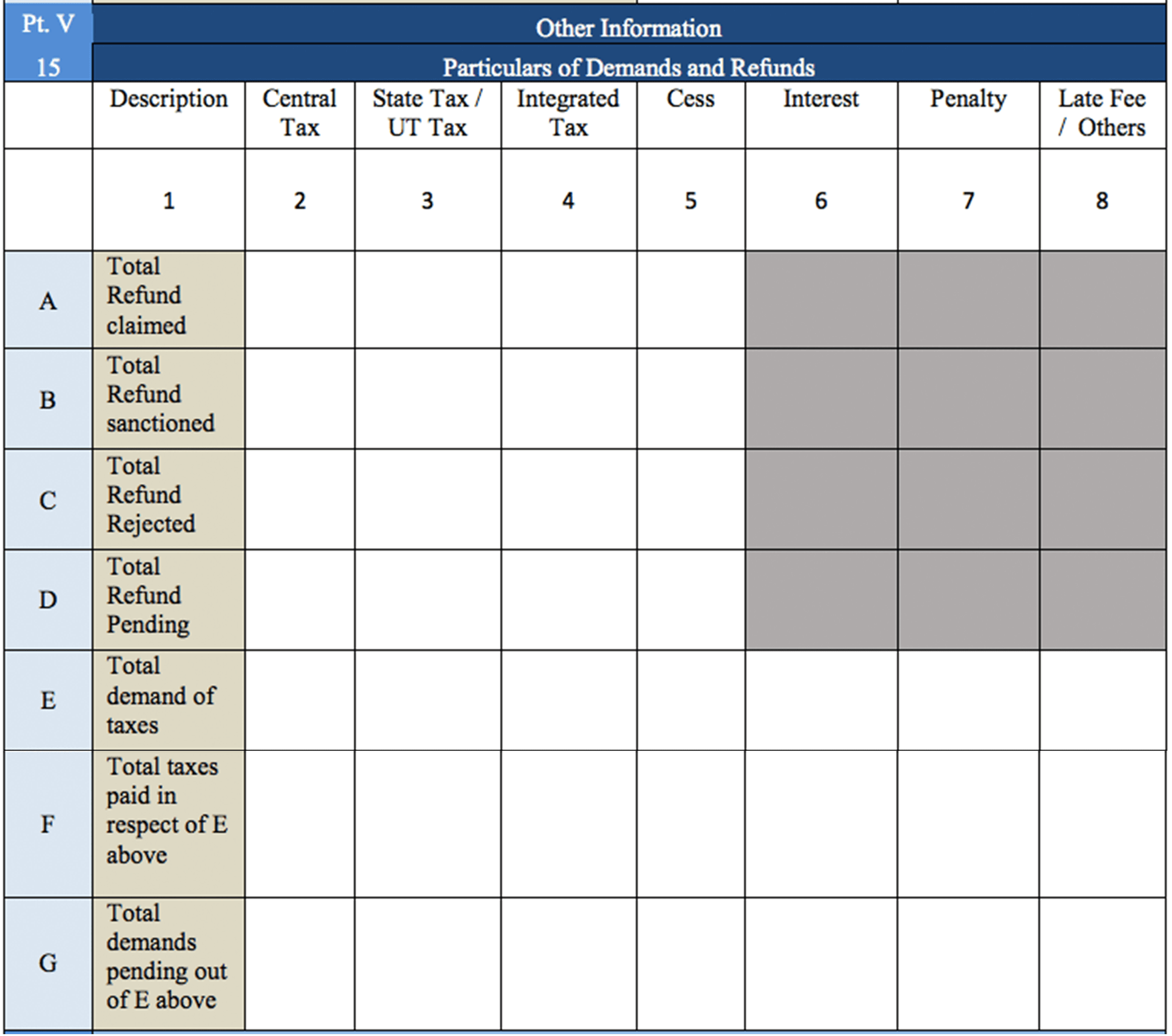In this part, mention details related to all refunds claimed, issued, pending, sanctioned, and rejected; credits availed or reversed; and late fees owed during the financial year.