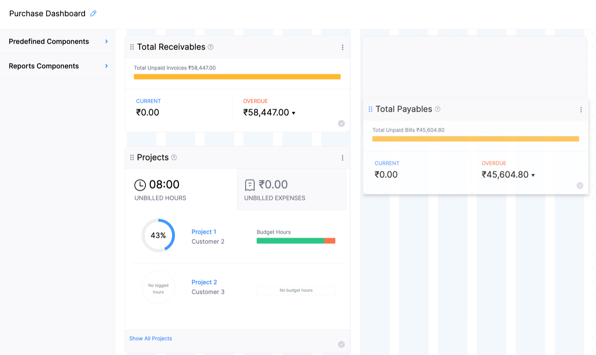 Note: Only the following reports and their custom reports can be added as report panels in the custom dashboard. Profit and Loss, Sales by Customer, Sales by Item, Sales by Sales Person, Invoice Details, Sales Order Details, Delivery Challan Details, Quote Details, Receivable Summary, Receivable Details, Payments Received, Credit Note Details, Bills Details, Vendor Credits Details, Purchase Order Details, Purchase Orders by Vendor, Purchases by Vendor, Purchases by Item, Expenses by Customer, Expenses by Project, and Billable Expense Details.