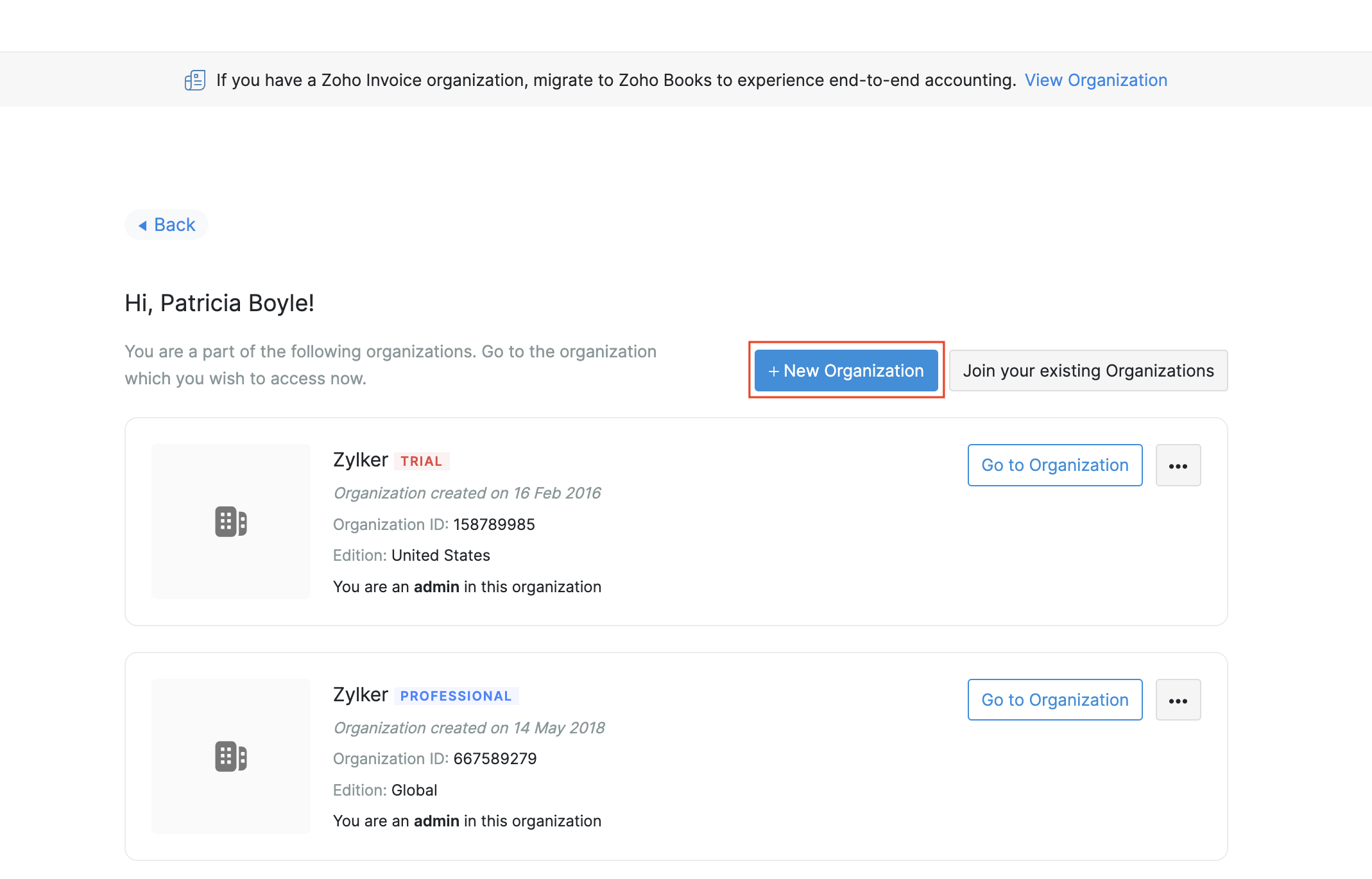 Now, a new organisation will be created and you can use it for free for the next 14 days, that is, the organisation’s trial period. If you want to use this organisation beyond 14 days for testing, you will have to extend the trial period by writing to support.india@zohobooks.com. After you complete your testing, you can delete this temporary organisation.