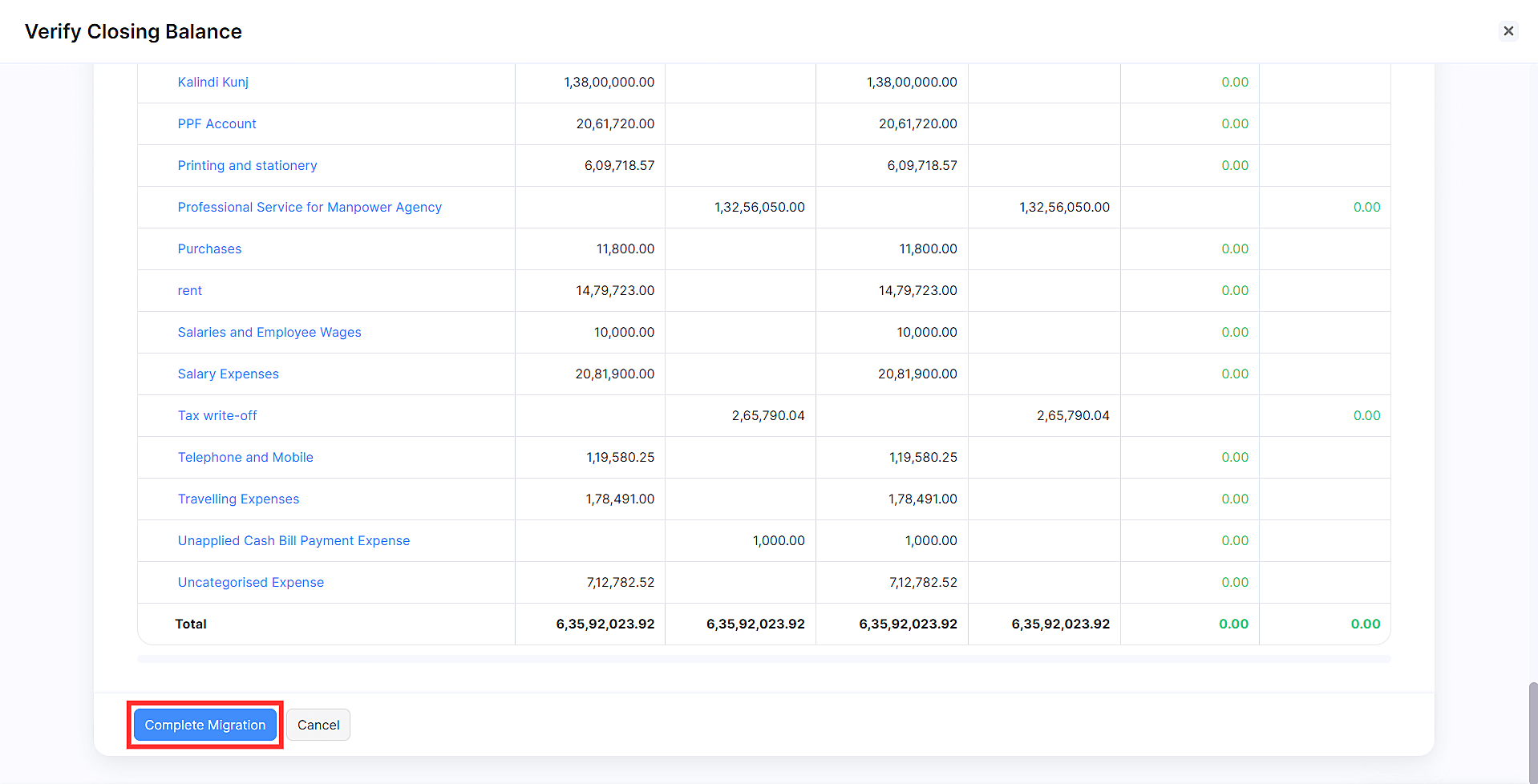 After importing the trial balance and verifying the closing balances, ensure that the net difference in the closing balance in Zoho Books and the closing balance in QuickBooks is zero for all the accounts. Next, click Complete Migration at the bottom of the page.