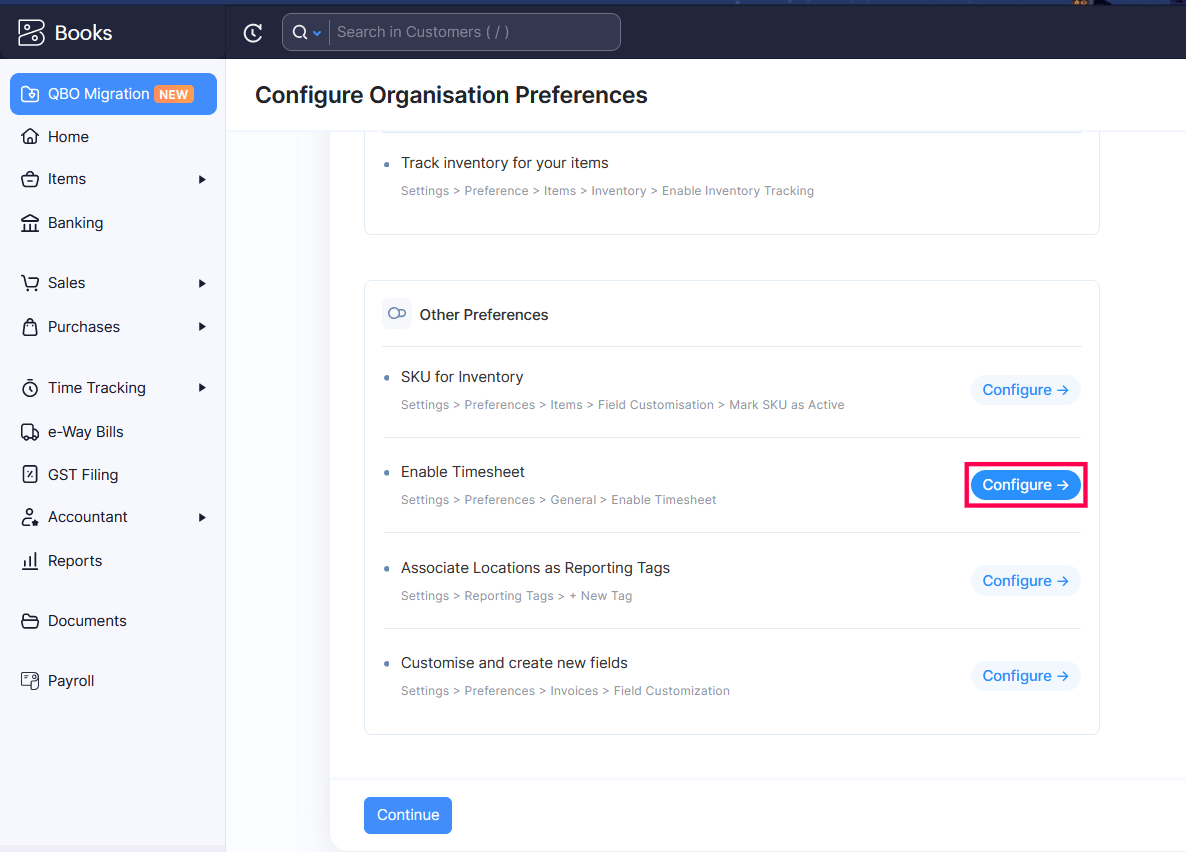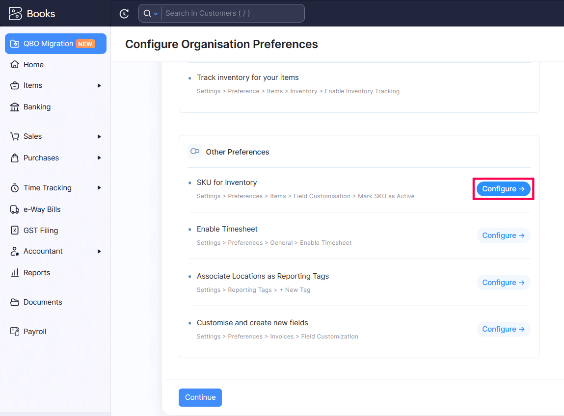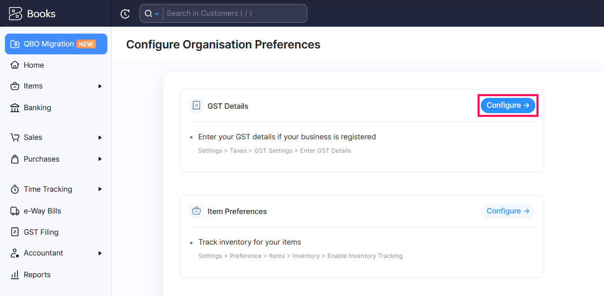 - In the Migrate your data to get started with Zoho Books section, click Configure Preferences next to Configure Organisation Preferences.