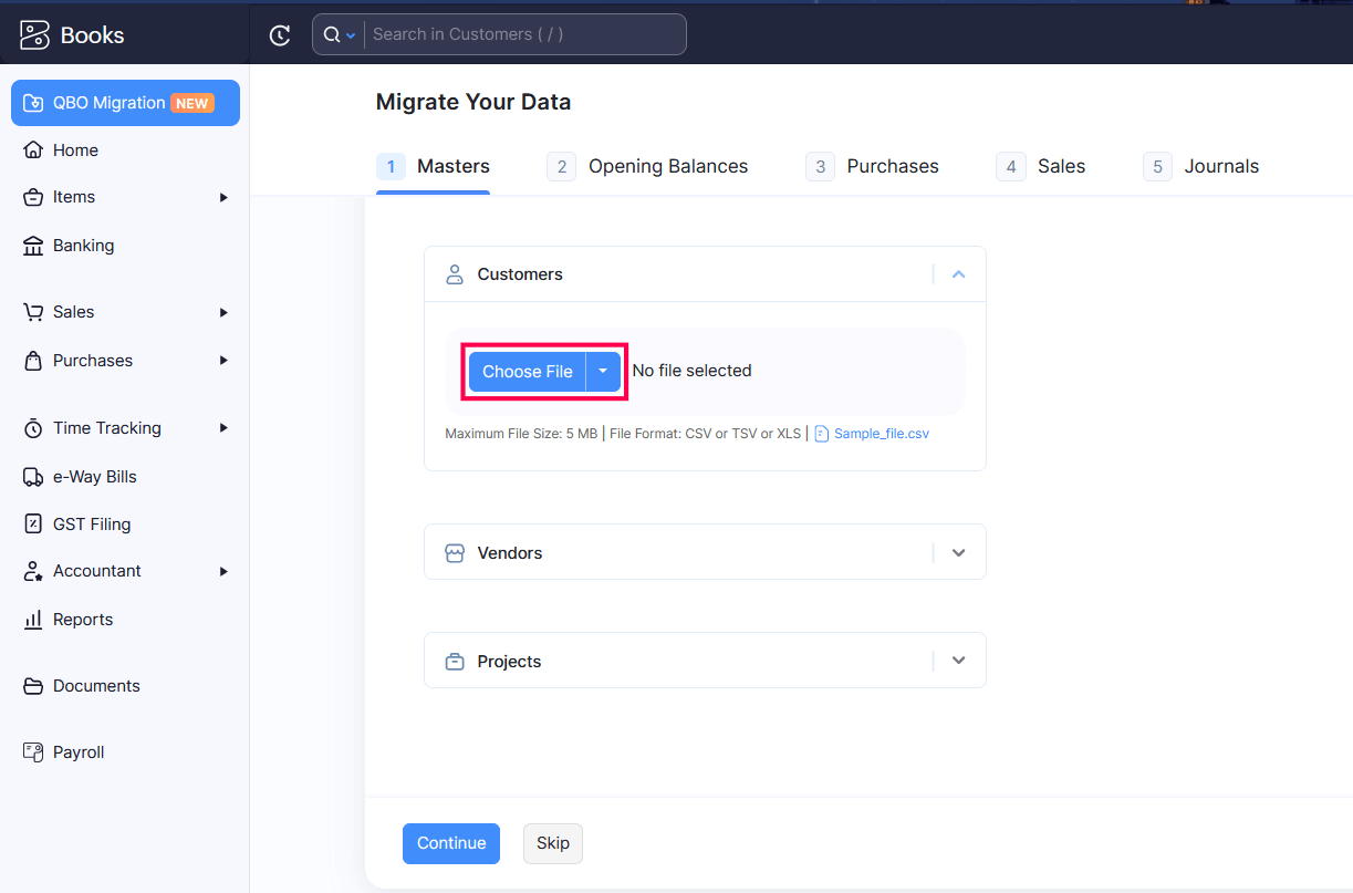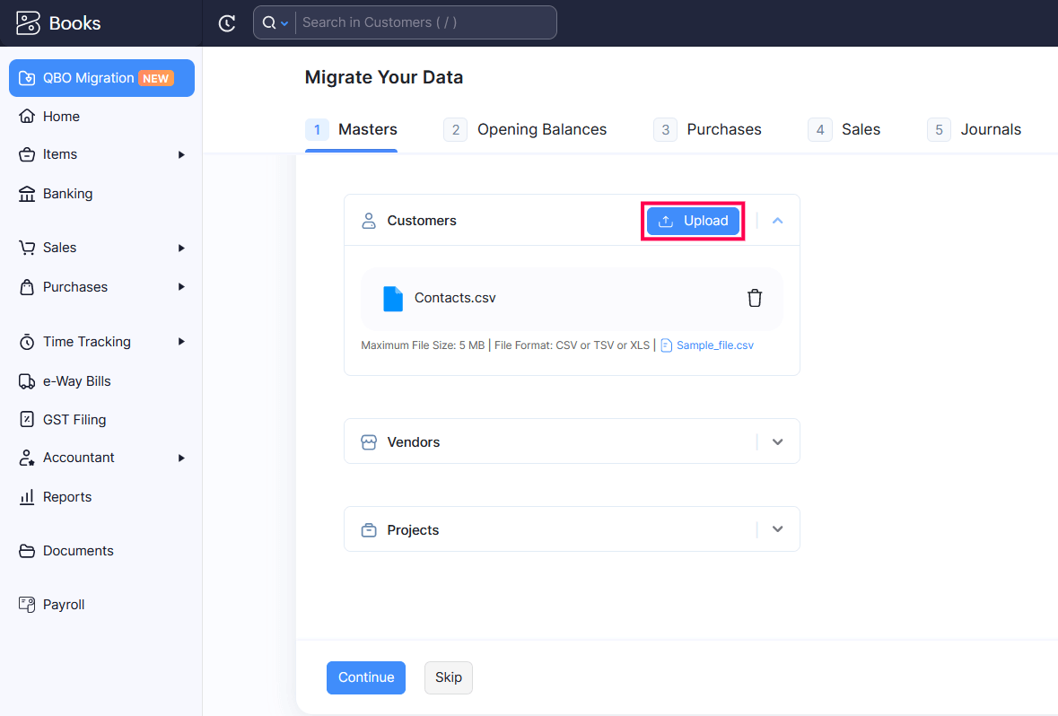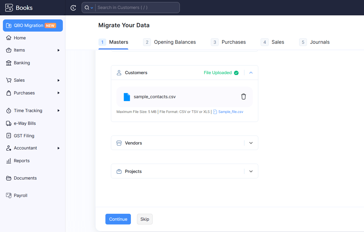 Follow the same process for the other modules under the Masters tab. Click Continue once you’ve imported data for all the modules under the Masters tab.
