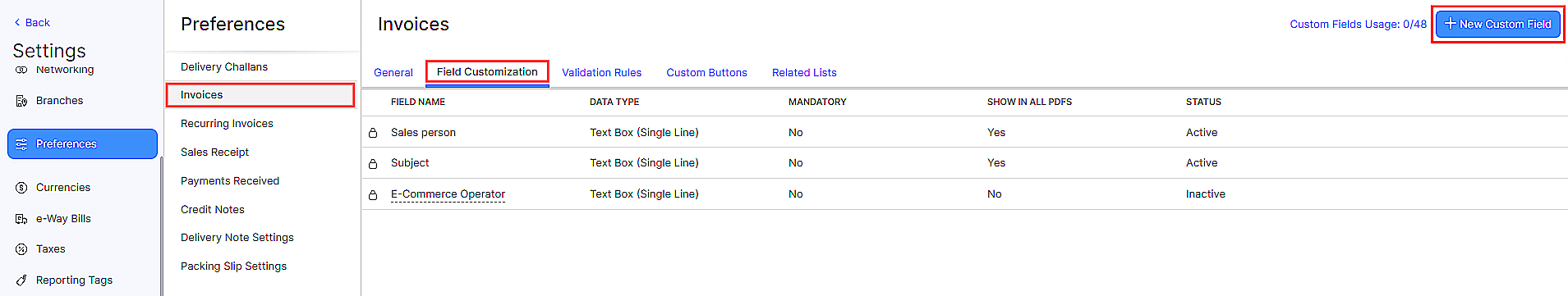 - Click + New Custom Field on the top right corner of the page.