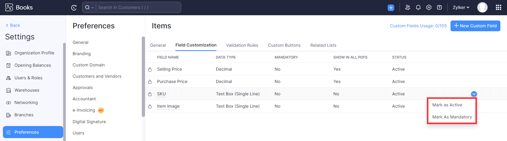 You can track inventory for the items in your organisation seamlessly using the Stock Keeping Unit (SKU). To do so, you will have to mark the SKU field as active and mandatory in Zoho Books. Here’s how: