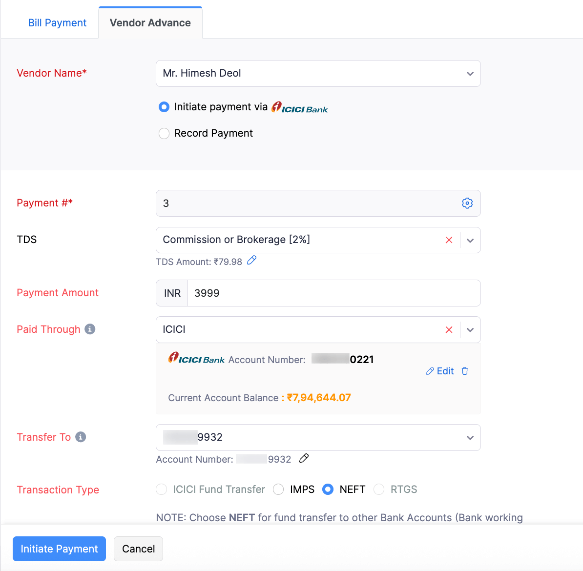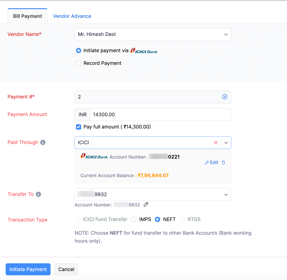 Choose the vendor for whom you would like to make payment and select the option Initiate Payment via ICICI Bank.
