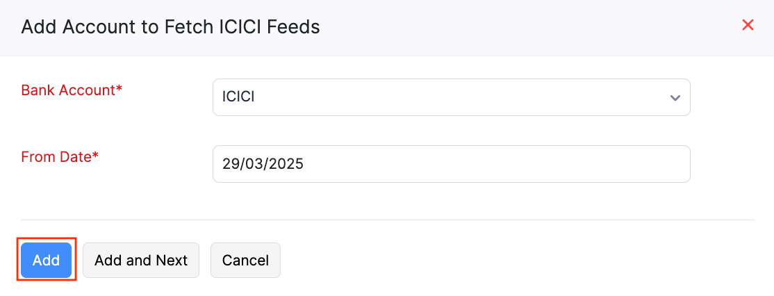Note: If you have not migrated to ICICI Bank Direct Feeds, you will be prompted to switch your bank feeds to the direct feed integration. Direct feed integration helps you to receive feeds quickly without any third party interference and find exact matches for your transactions.