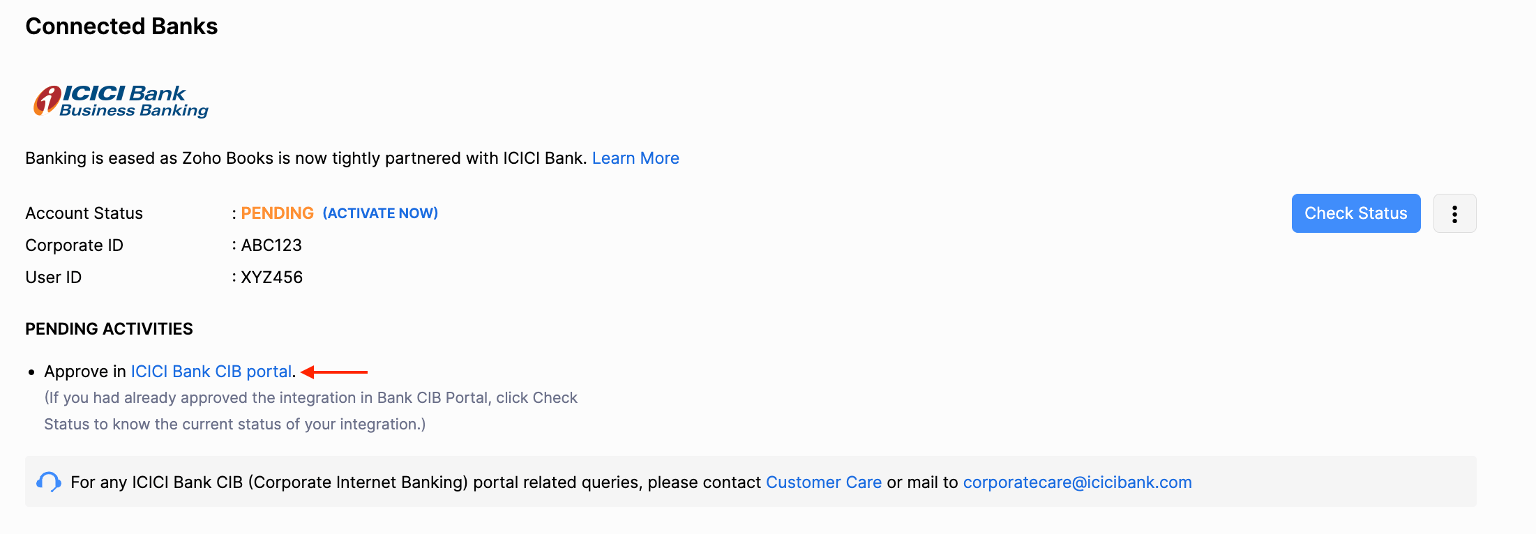 Note: You can also click Activate Now next to the Pending status and proceed to approve the integration or log in directly to the ICICI Bank CIB portal.