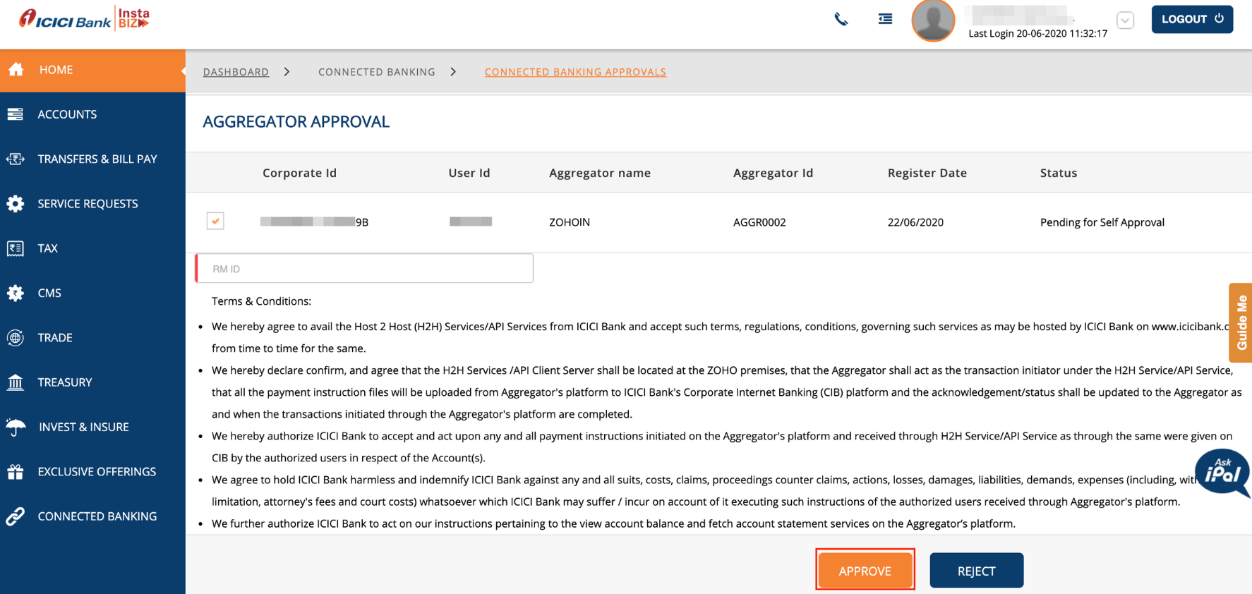 Click Approve in ICICI Bank CIB Portal under the Pending Activities section.