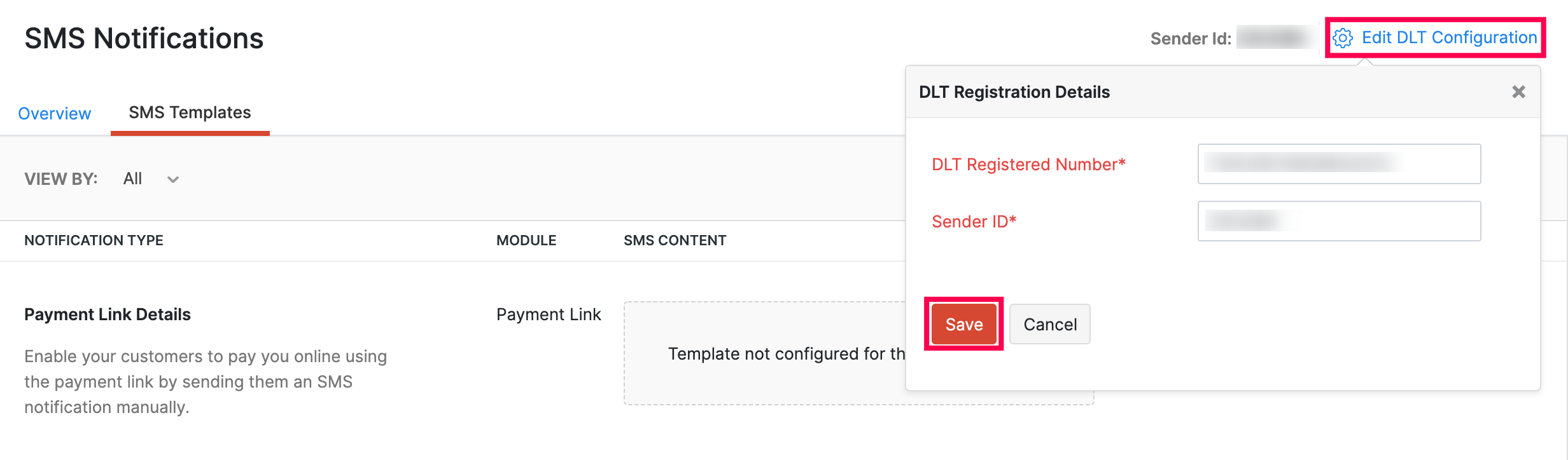 Enter the Template ID and SMS Template that was approved in the DLT platform.