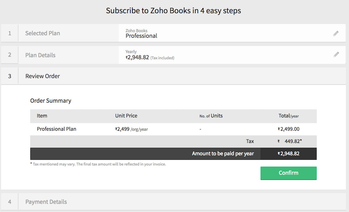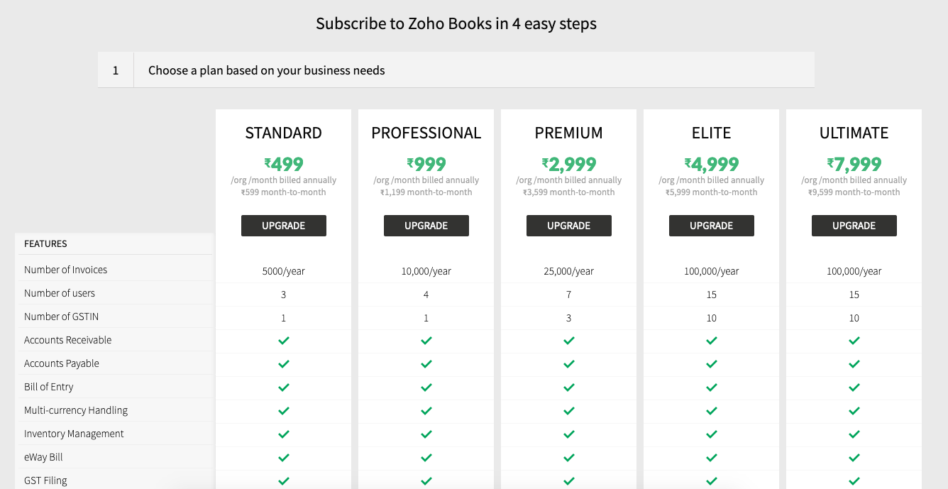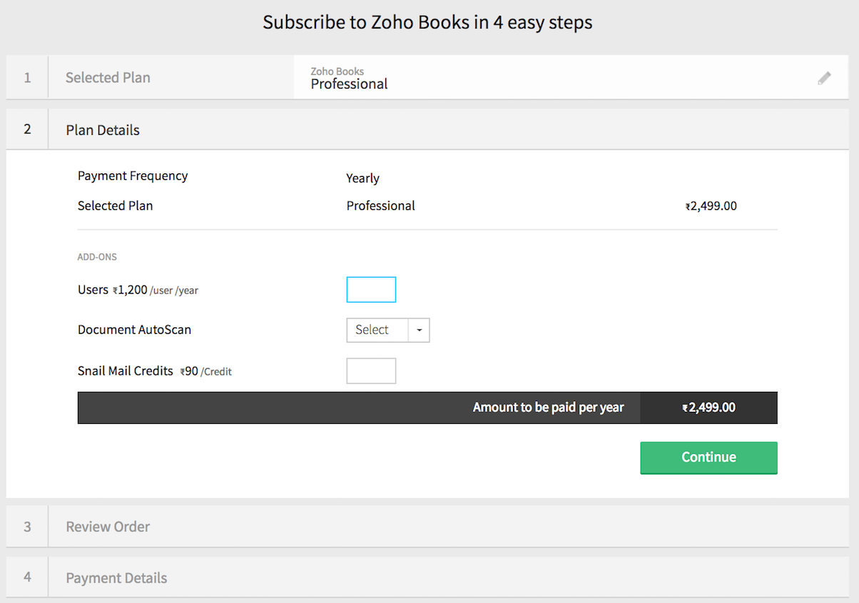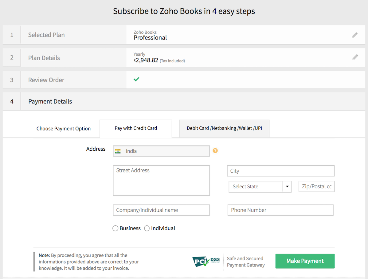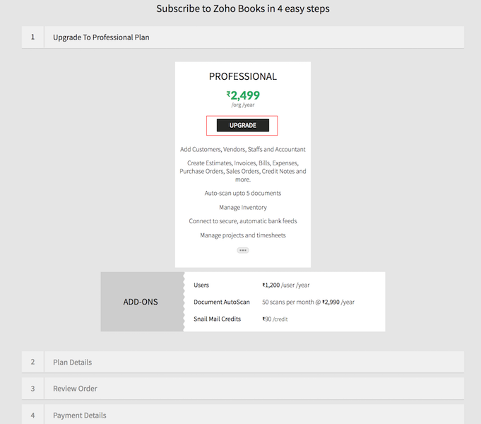 Note: The payment you make will be for a single organization in Zoho Books. If you have multiple organizations, you’ll have to upgrade each of them separately to the paid plan.