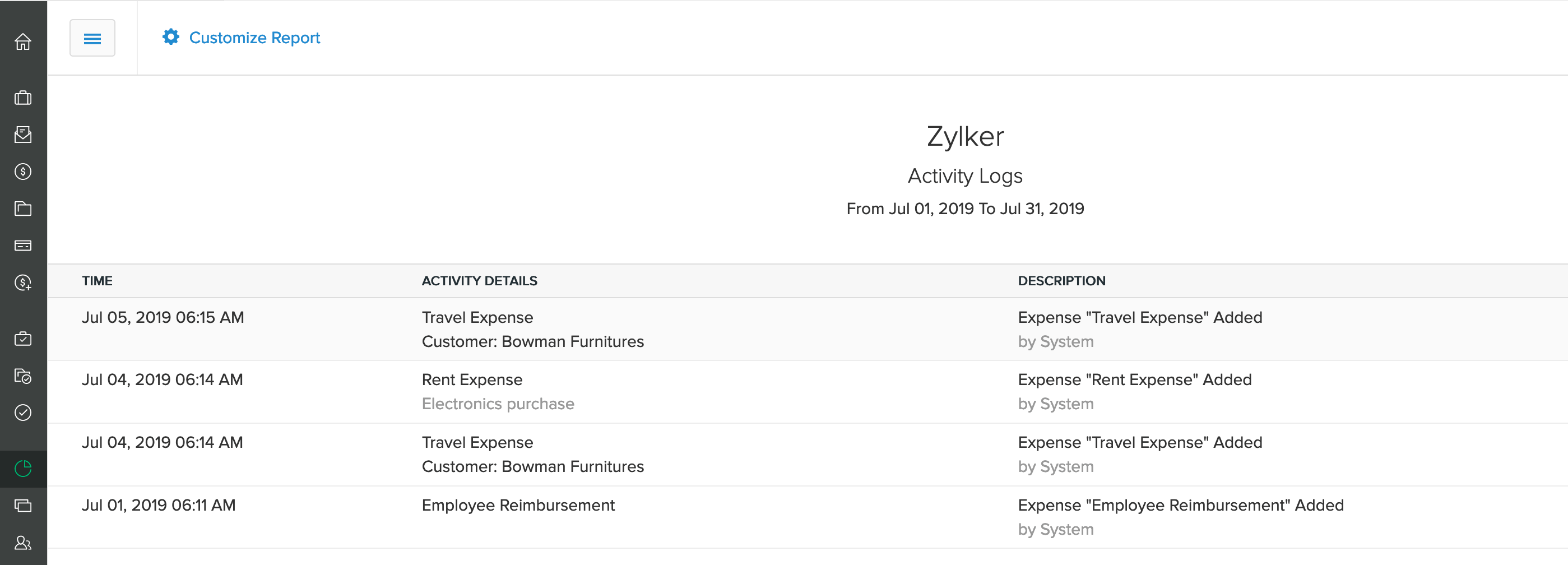 - Expense reports details: Displays all expense reports generated within a specified time period.
