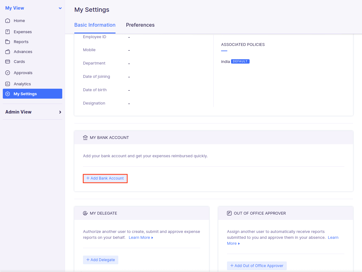 - Enter your bank details and click Save. The bank account will be added and the employee will receive reimbursements to this account.