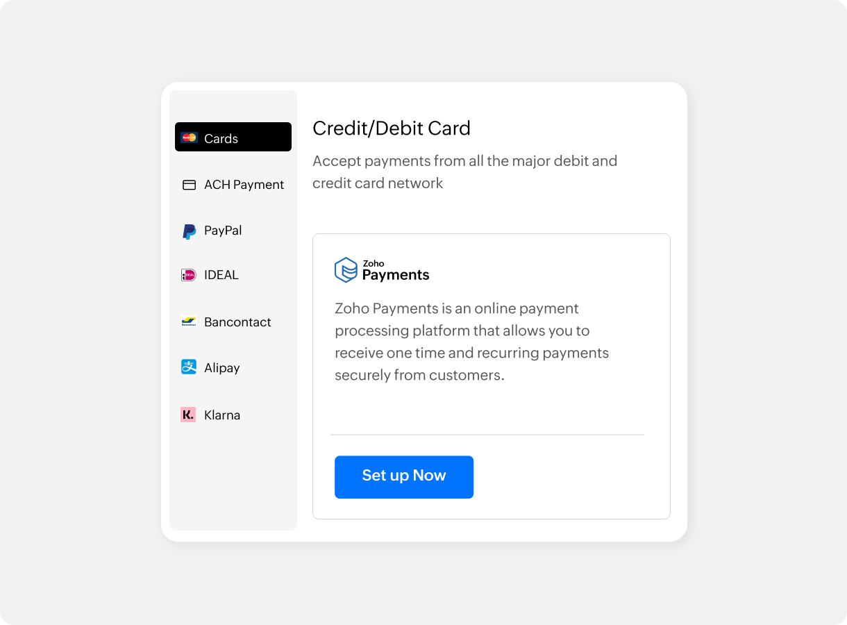 Connect with diverse payment gateways such as Zoho Payments, Stripe, Razorpay, Paytm, and more.
