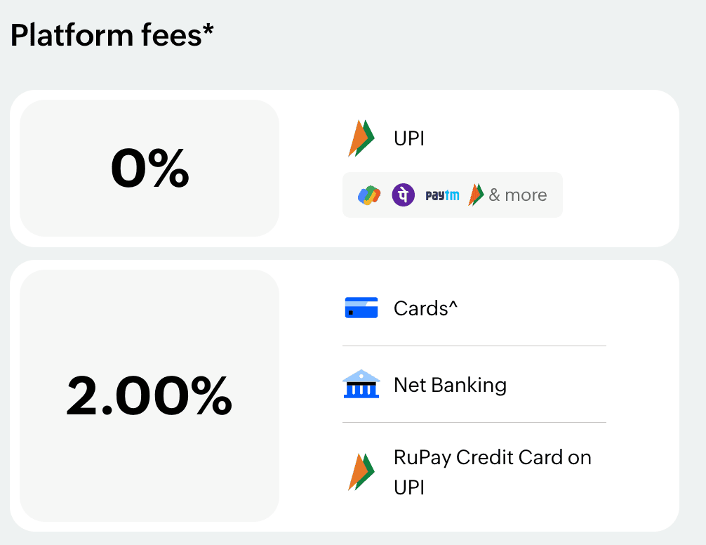 UPI - 0.5% (2% for RuPay Credit Cards on UPI)