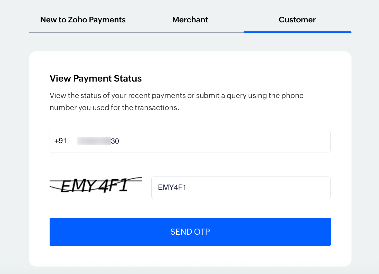 When you make a payment to a merchant through Zoho Payments, you’ll be required to enter your phone number. You can check your payment status on the Zoho Payments website using this phone number. To check your payment status: