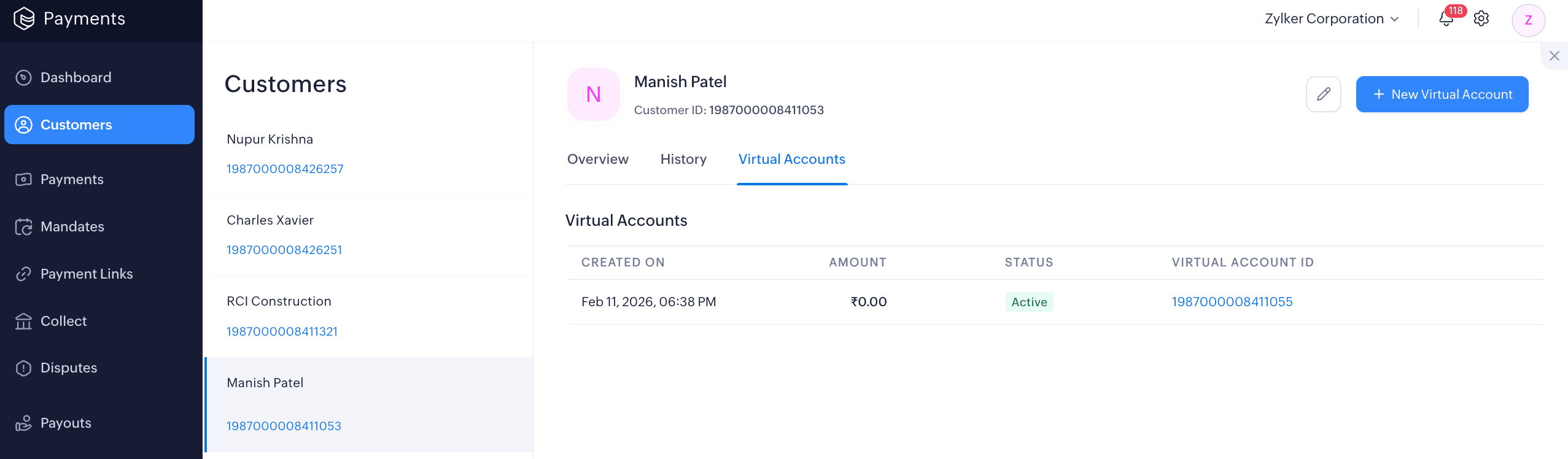 View all virtual accounts created for a specific customer from the Customers module’s Virtual Accounts tab, including Created On, Amount, Status, and Virtual Account ID. Clicking on a virtual account will take you to the Collect module, where you can view a detailed overview of the account.
