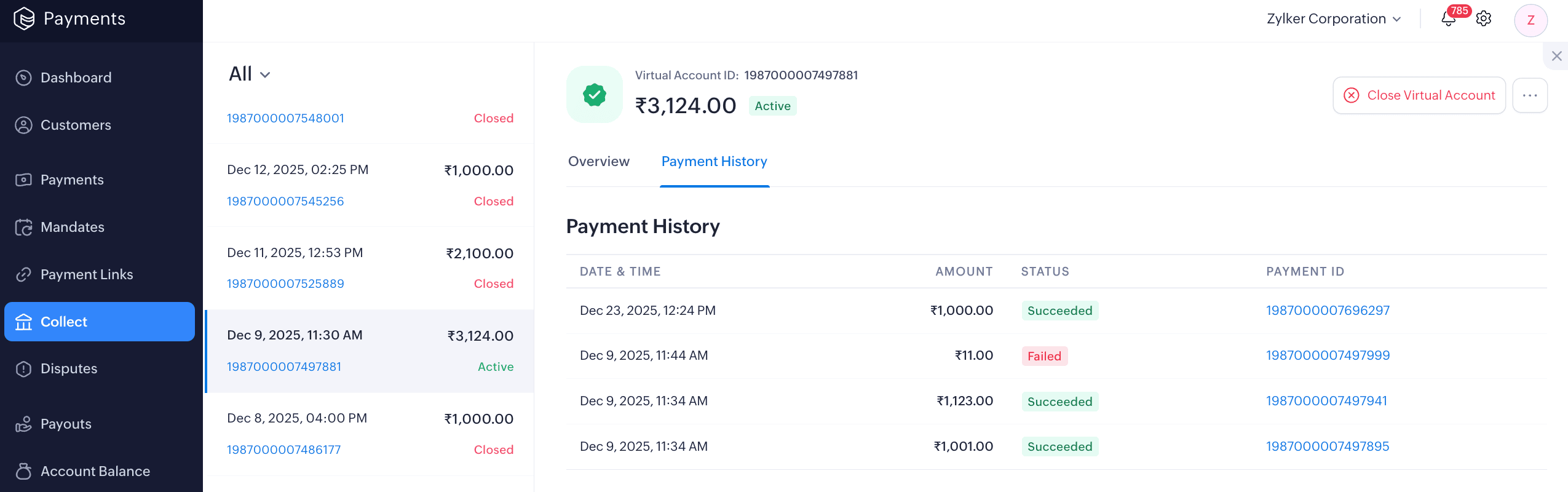 - Closed: Virtual account has been closed and no further payments can be made.