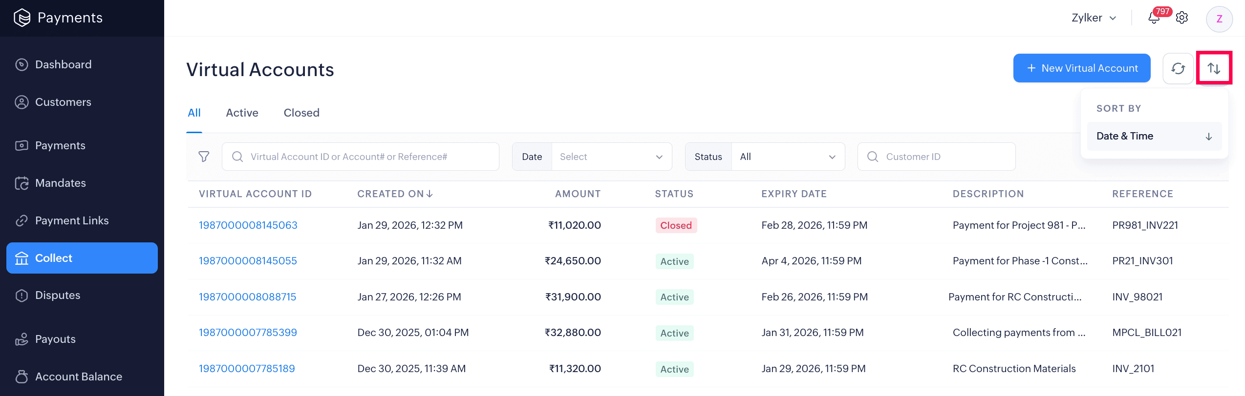 The Collect module in the left sidebar displays all the virtual accounts you have created. The list view shows key details such as Virtual Account ID, Created On Date, Amount, Status, Expiry, Description, and Reference.