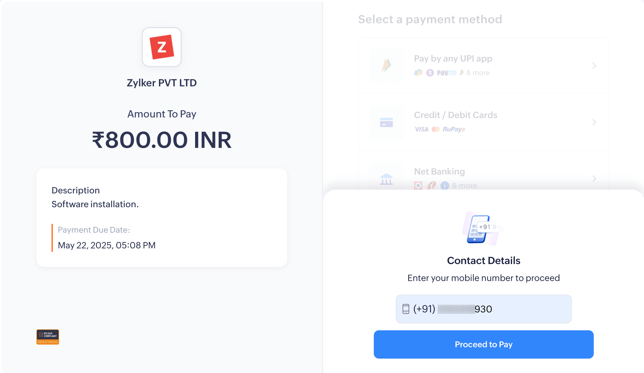 Zoho Payments allows you to reflect your brand’s identity during every transaction by customizing your name, logo, and colours displayed on the checkout widget and payment links. This provides a professional payment experience, enhances your brand visibility, and reassures customers that they are making the payment to the right business.