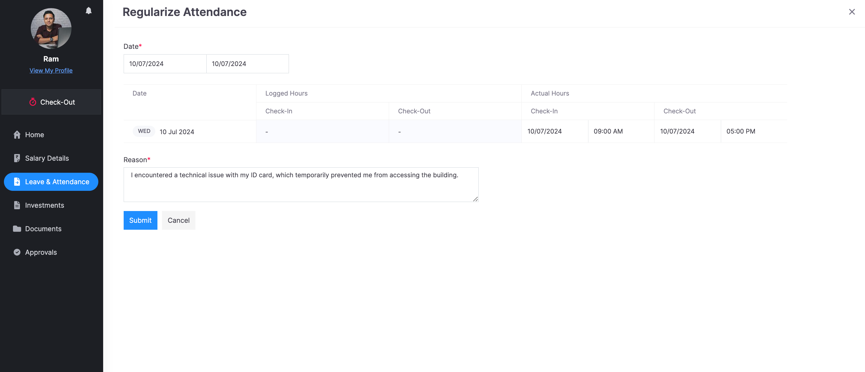 • In the Reason field, explain why the regularisation is needed (e.g., forgot to check in/out, technical issues).