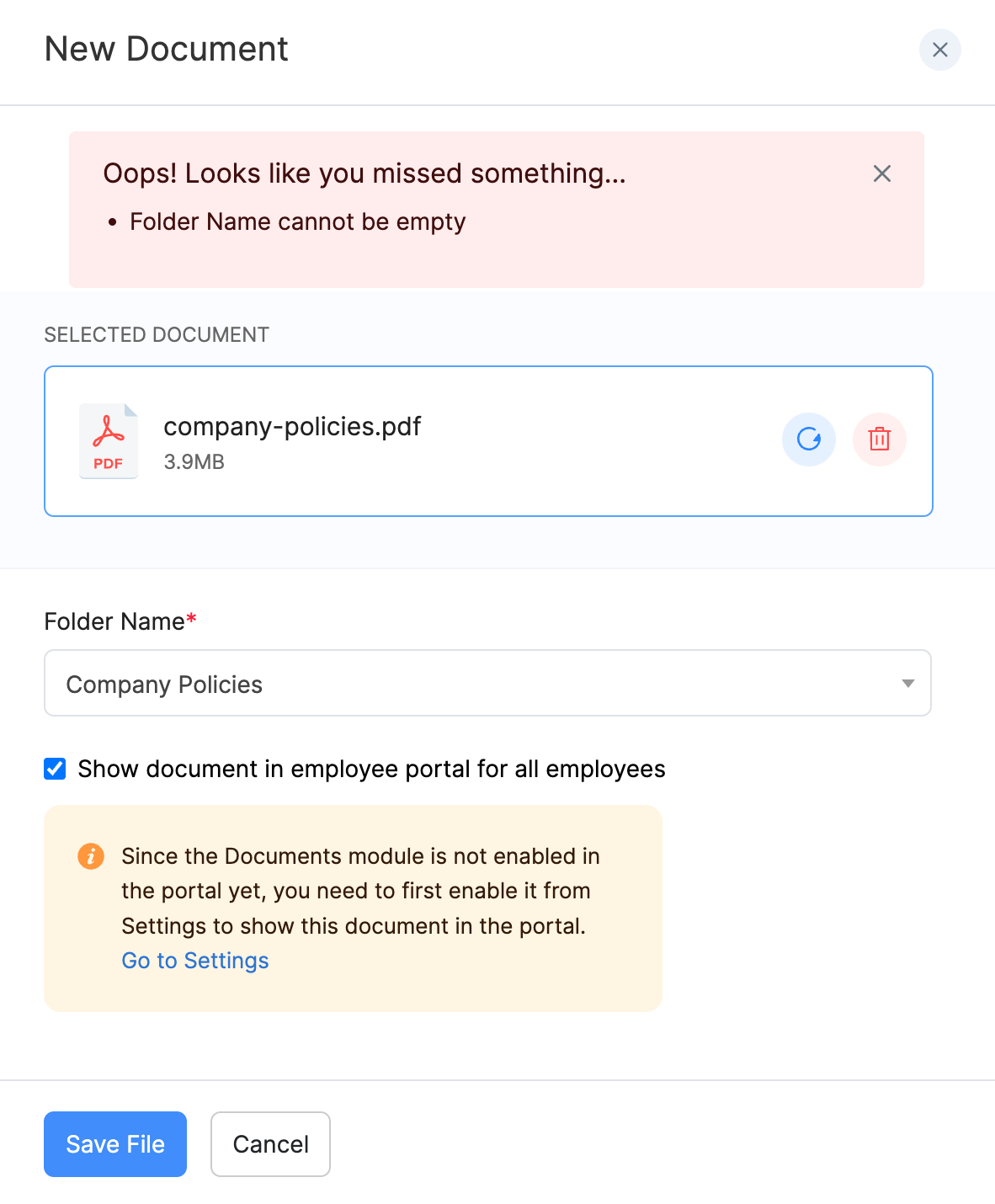 Pro Tip You can also upload a compressed folder containing employee documents to upload them in bulk. Ensure that it is a ZIP folder and that the file names of the documents match the employee IDs. Once uploaded, employees will be able to access their respective documents from the Documents tab in their Employee Portal.