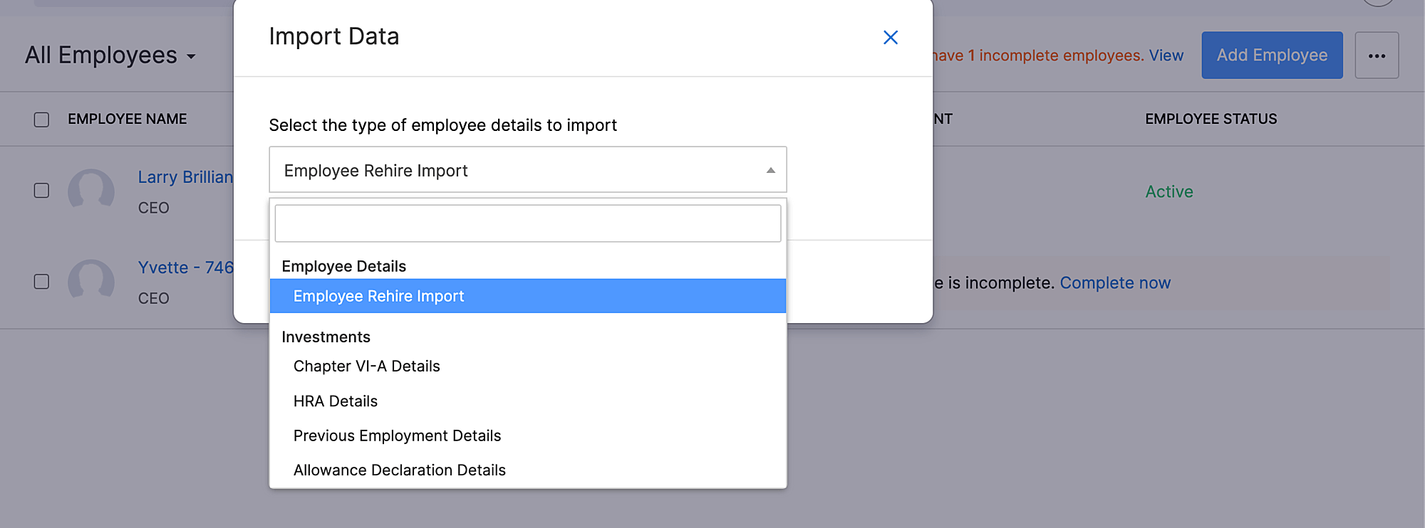 If you have integrated Zoho Payroll with Zoho People, rehiring employees becomes even more streamlined. Once employees and their details have been fetched from Zoho People, you can easily rehire them.