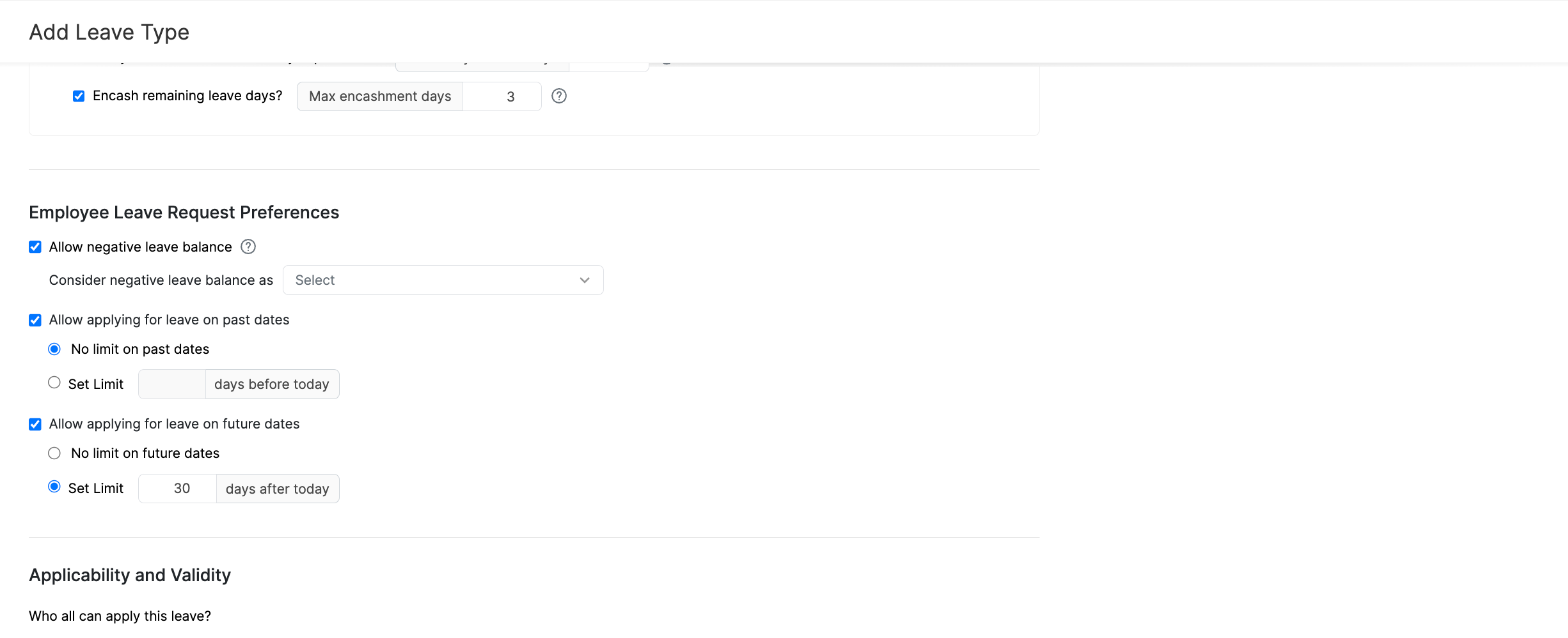 - Select Allow applying for leave on past dates if you want your employees to request leave for dates that have already passed.