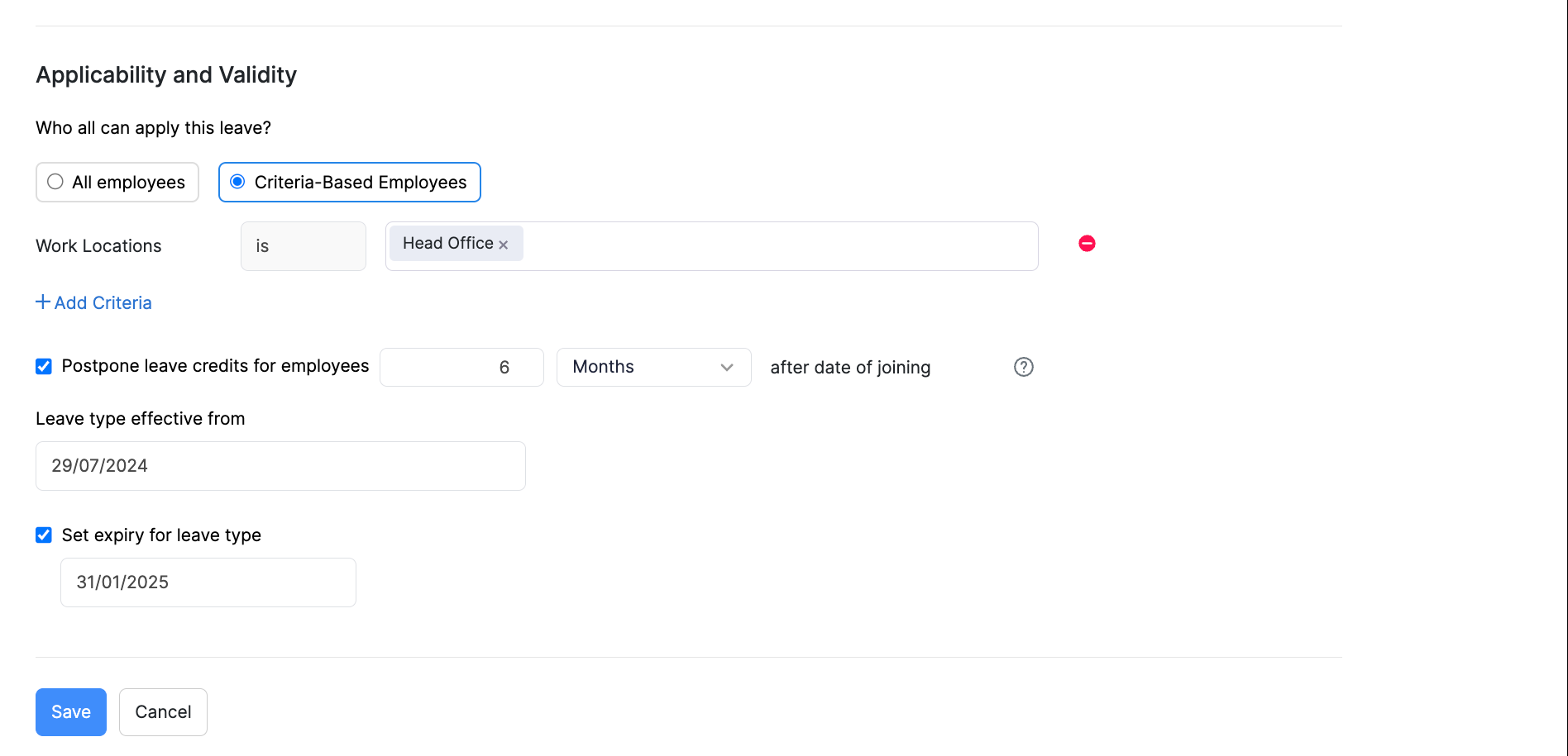 - Choose Criteria-Based Employees option if the leave type should only be available to a specific subset of employees. You can define the criteria based on: