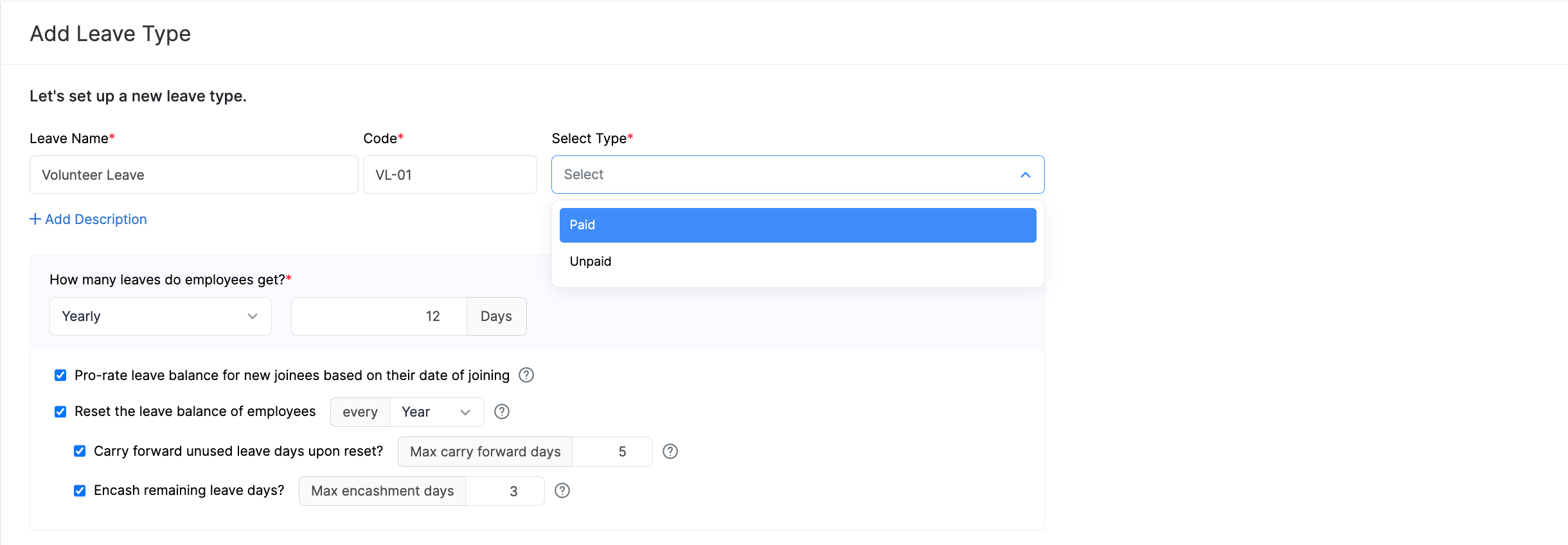 - Provide a description about the leave type to help employees understand its purpose.