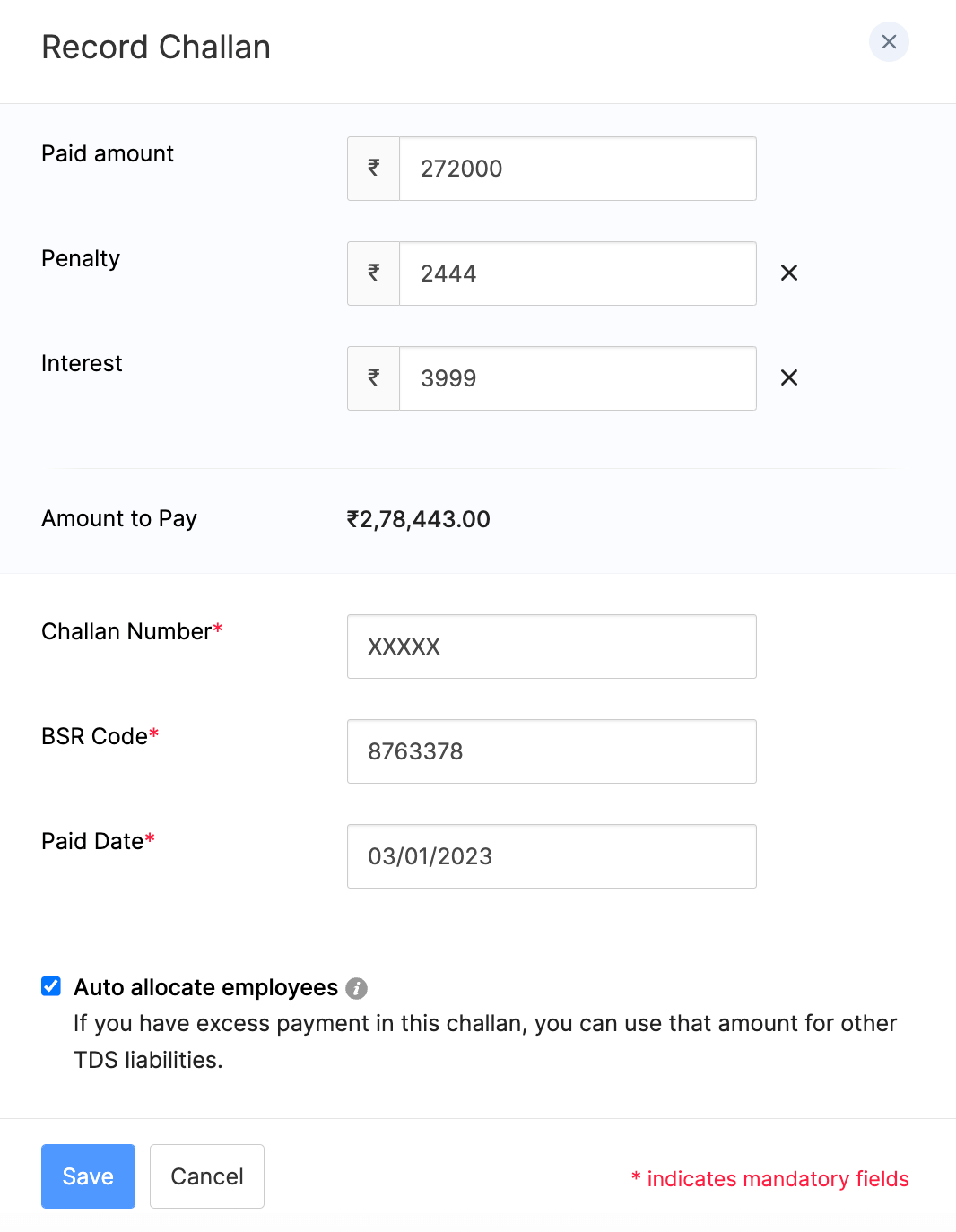 - Select Auto**-**allocate Employees if you want Zoho Payroll to automatically associate the payment amount of this challan to the TDS Liabilities of all employees for this month.