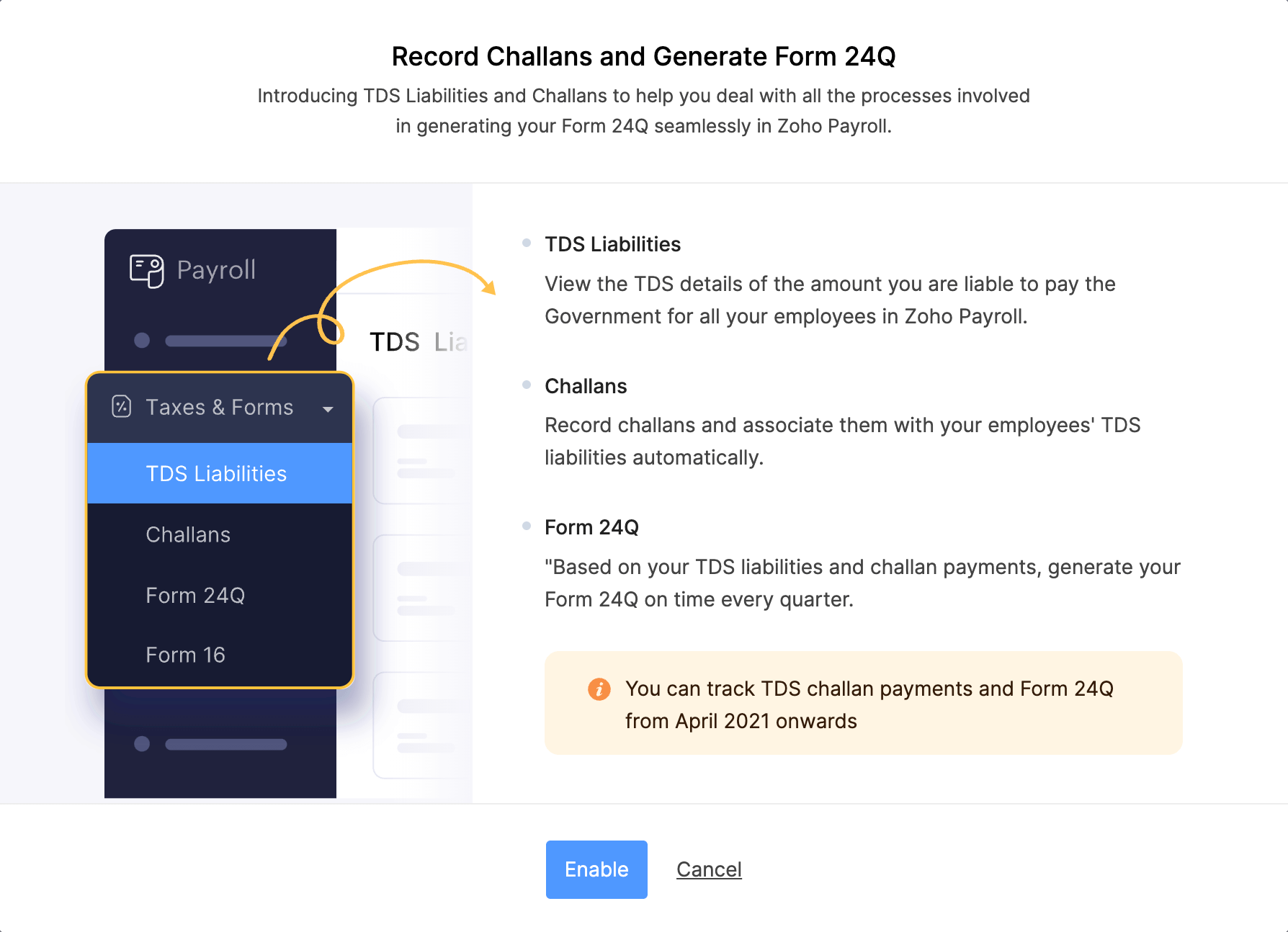 Pre-Requisite: You need to enable the feature first to view the TDS Liabilities, Challans, and Form 24Q modules.