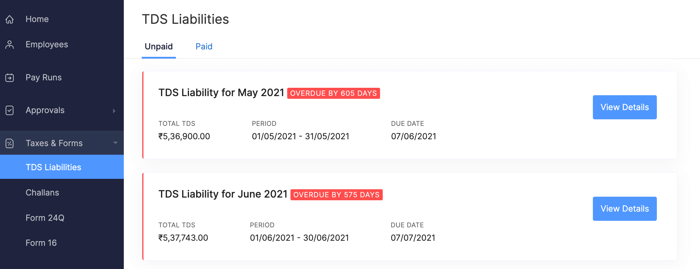 You can to view the Total TDS, Period, Amount Due, and Due Date. You can switch to the Employees tab to view the Taxable Amount, Total TDS, TDS Paid, associated challans, and the payment status.
