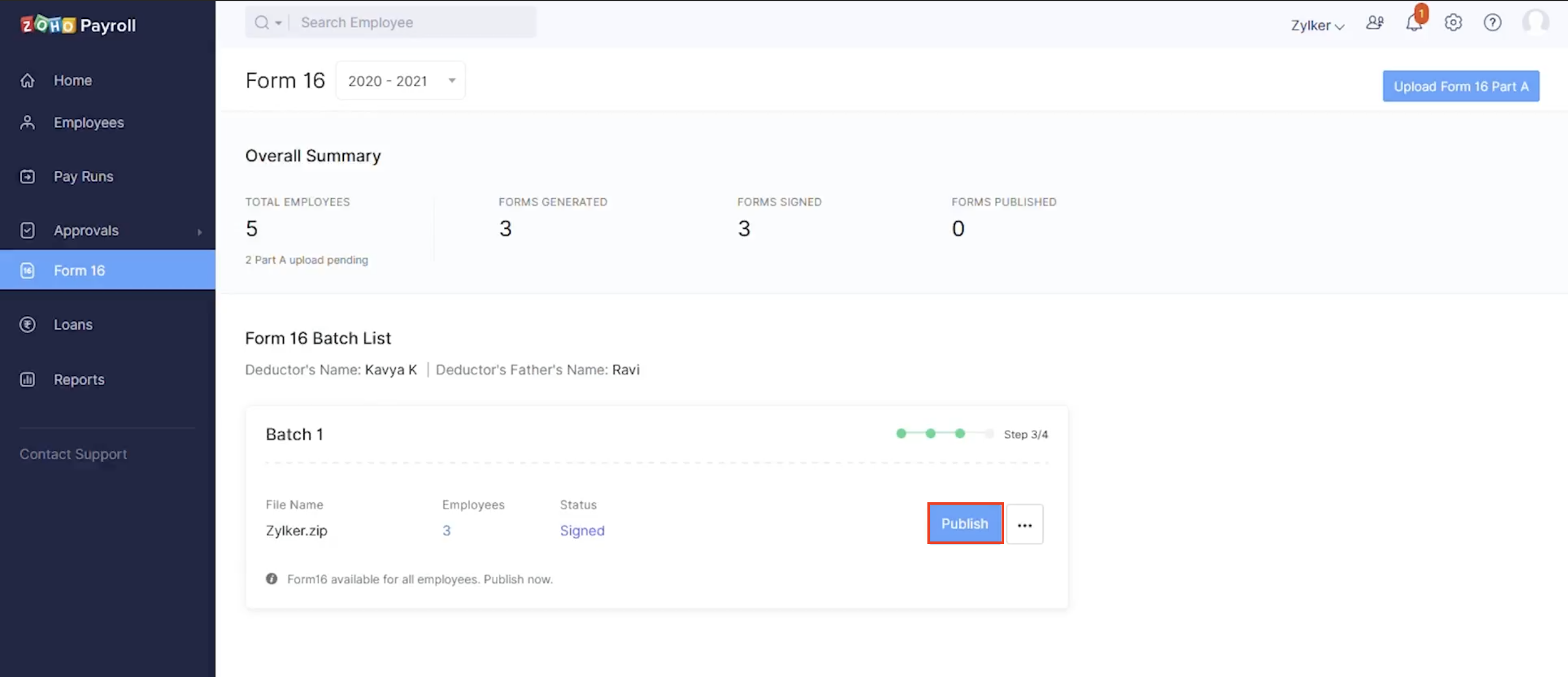 If you’ve published it already and want to send it again to your employees, go to the Form 16 module, click View Details next to the batch you want to publish and then, click Publish.