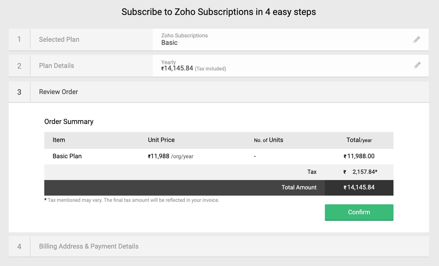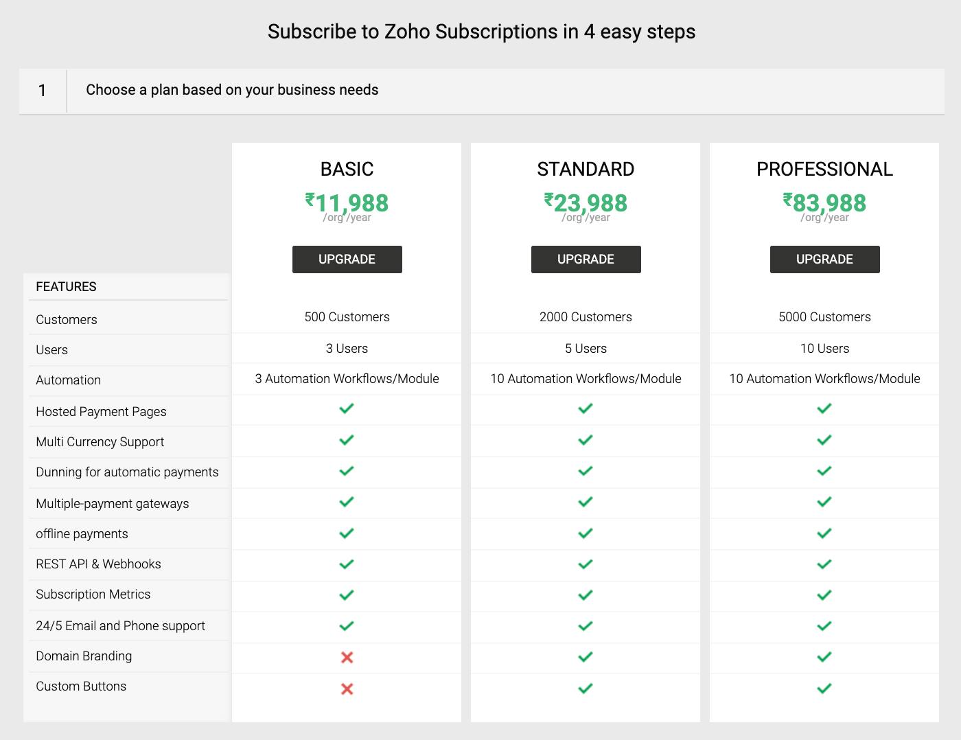 When you sign up for Zoho Billing, you’ll get a 14-day free trial that lets you explore different paid plans. You can explore the features available in the plan. Once the trial period expires, you’ll have to subscribe to a paid plan to continue using Zoho Billing.