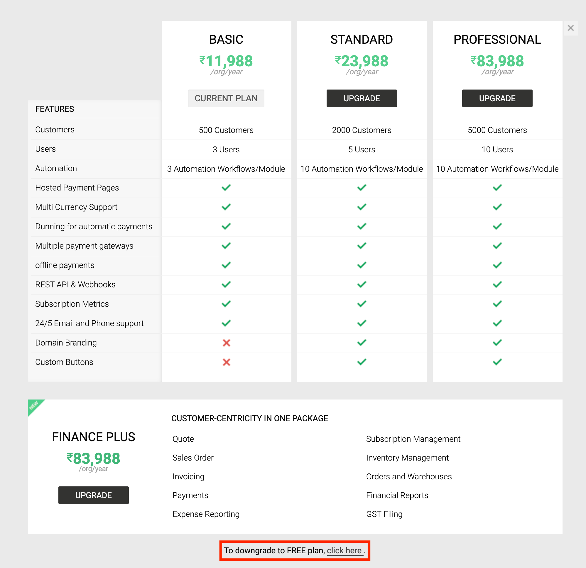 - Select the plan you want to downgrade to by clicking Downgrade under the plan name.