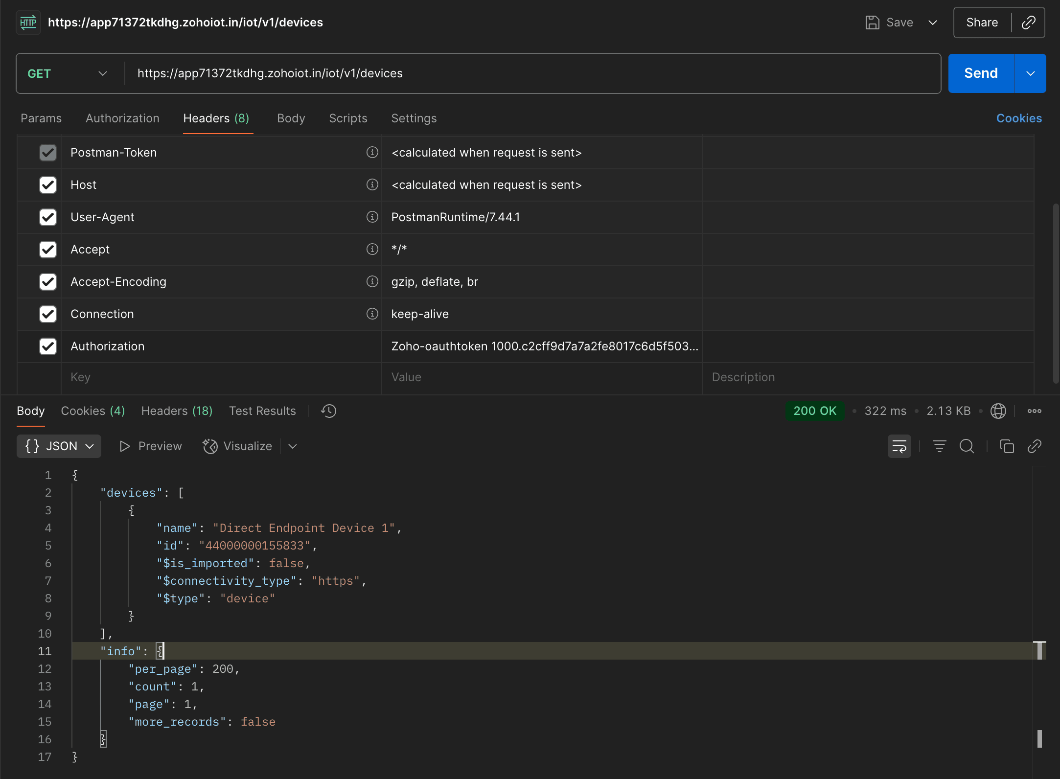 In the below sample implementation on generating Access Token we have used the scope ZohoIOT.modules.devices.ALL. Using this access_token, you can access the device information available in the application.