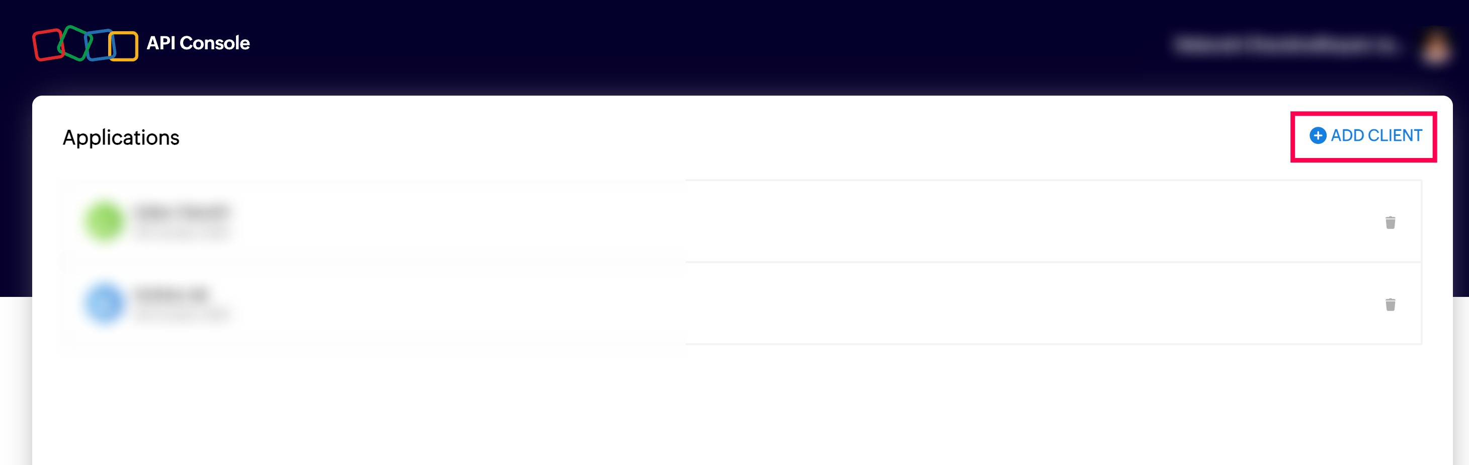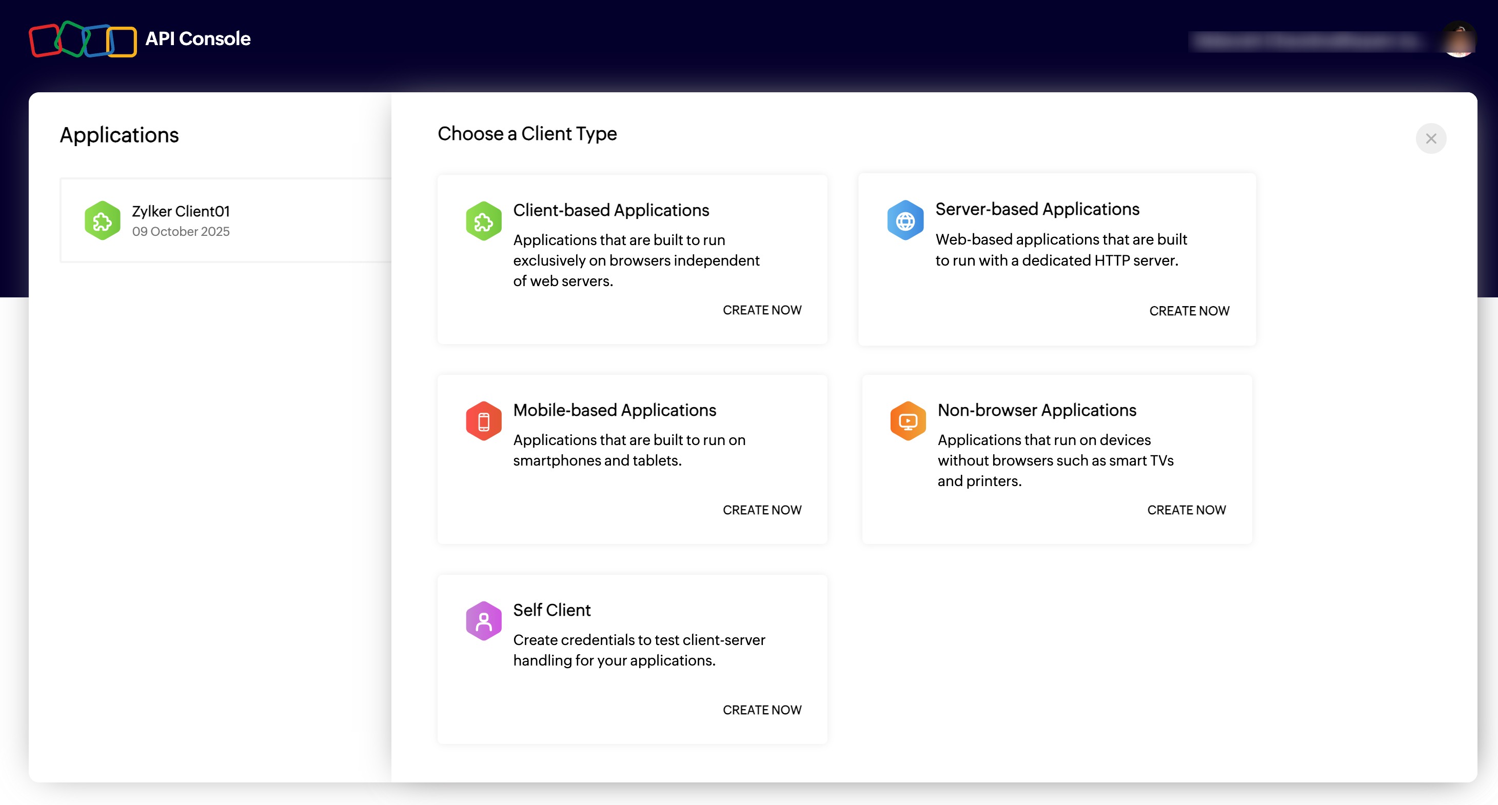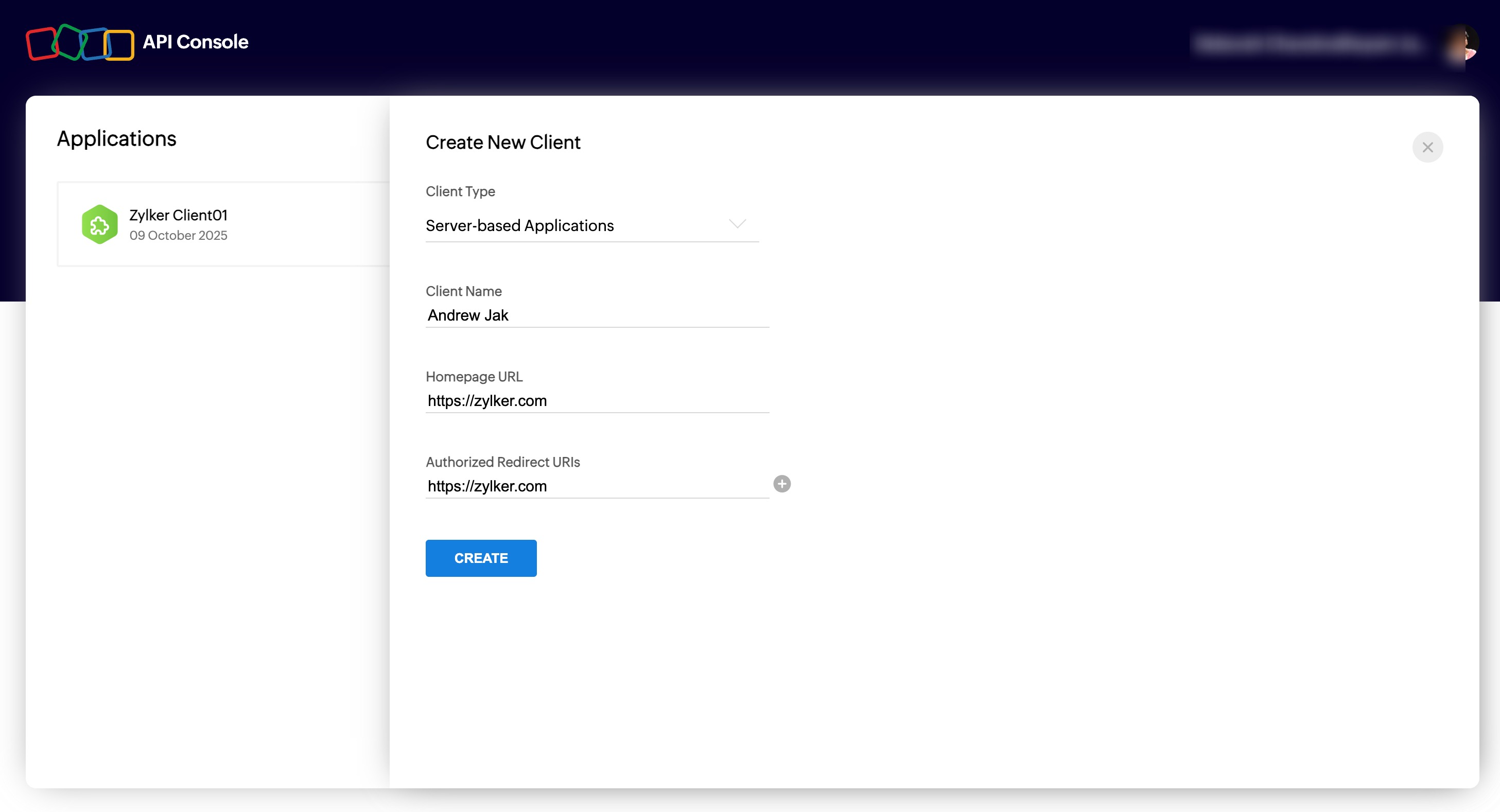 Note: Replace your location's Base API URI when accessing Zoho Account's developer console using https://accounts.zoho.in/developerconsole