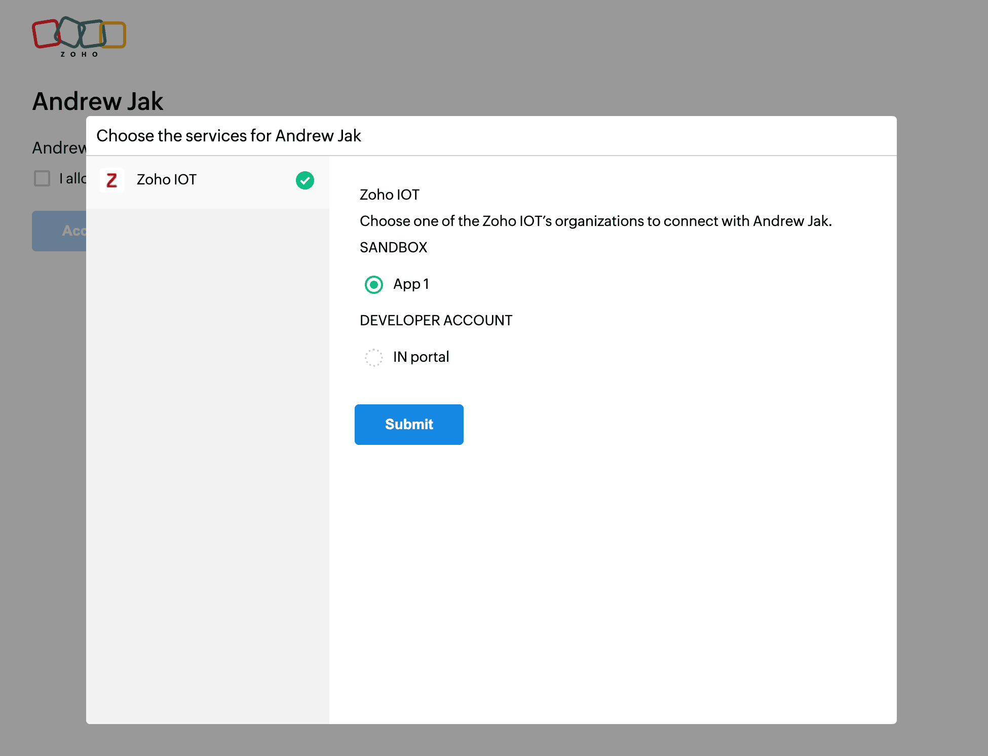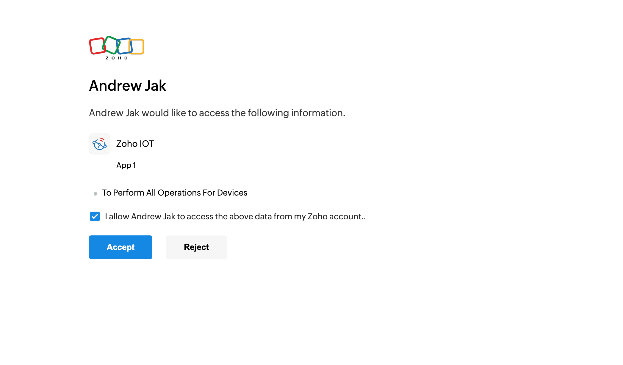Click Accept, and Zoho will redirect to the given redirect_uri with the grant token (code).