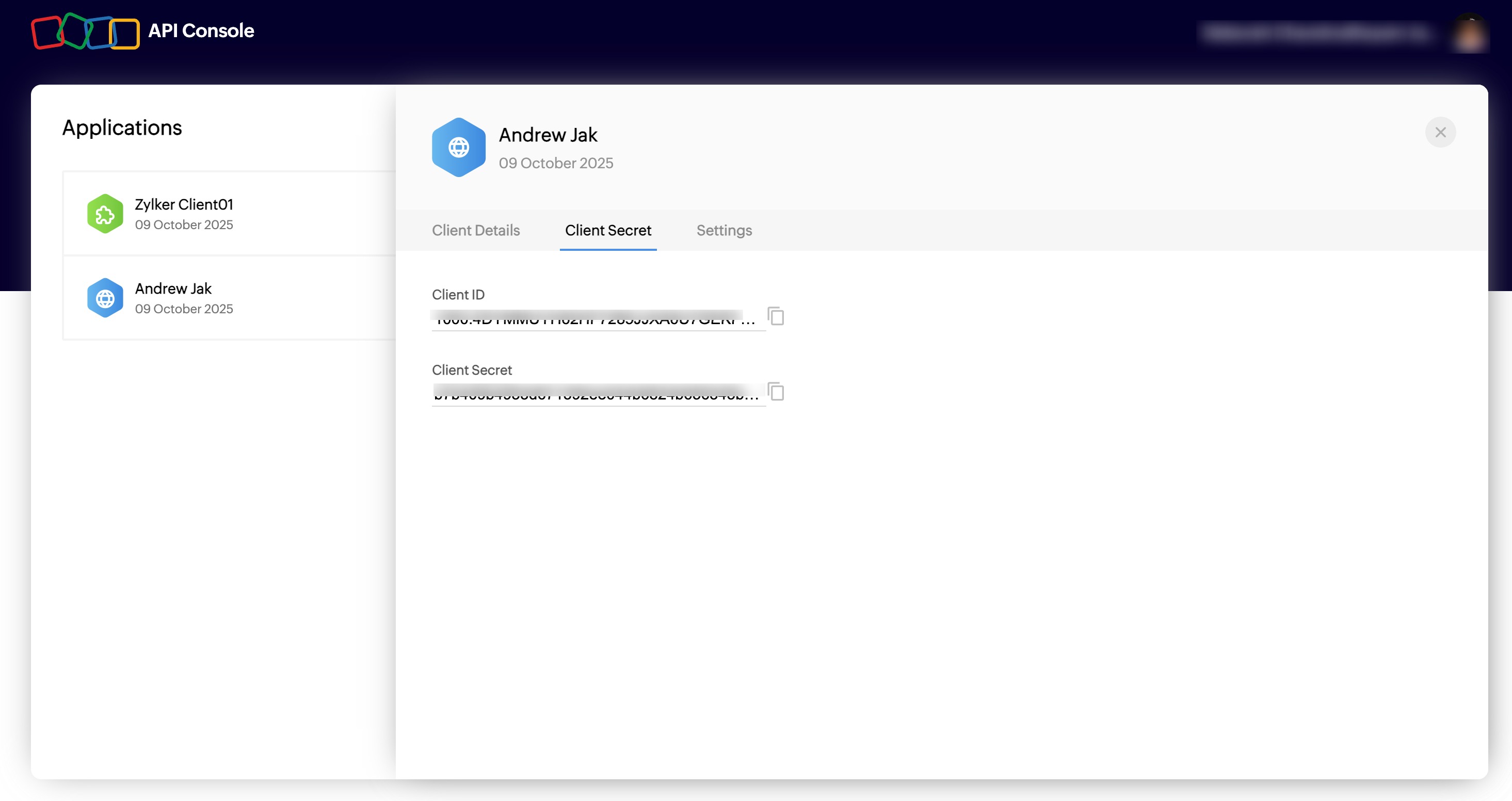 The first step in using OAuth authentication is registering your app with the Zoho API console. Once you register your client(app), you will get a Client ID and Client Secret for your application. This Client ID and Client Secret are used to authorize your app's OAuth requests.