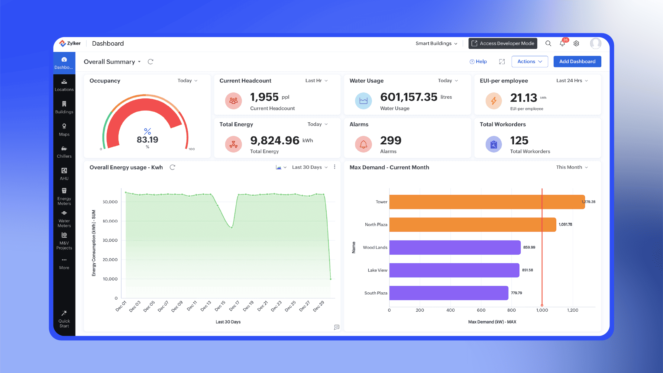 - Energy & Utilities Use Case: A commercial facility or substation integrates BMS for HVAC and lighting control. Zoho IoT analyses BMS data alongside energy meters to predict peak loads, automatically dim lights or adjust temperatures, reducing costs by 15-20% while maintaining comfort.