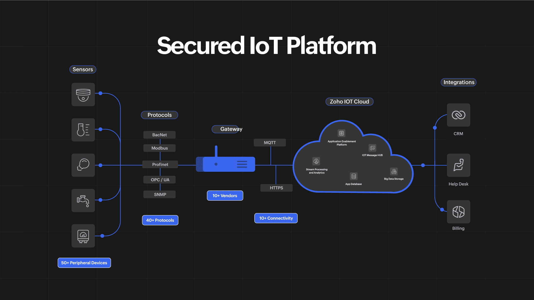 Zoho IoT bridges OT (PLCs, SCADA) with IT (MES, ERP) for predictive, scalable operations.