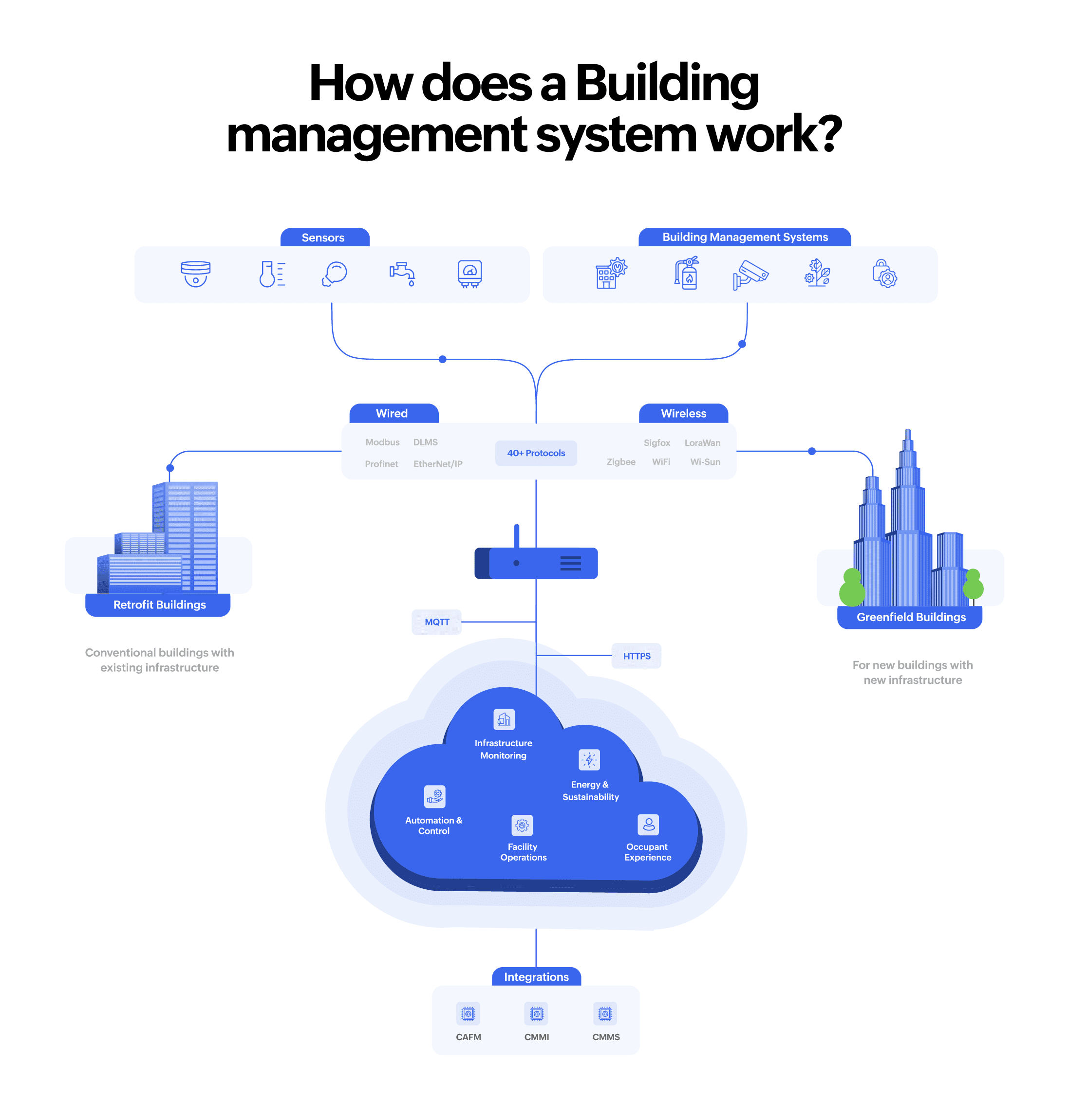 A BMS encompasses sensors and various hardware components placed throughout a building to collect data and display insights through a cloud-based dashboard, enabling facility managers to manage both electrical and mechanical systems with ease.