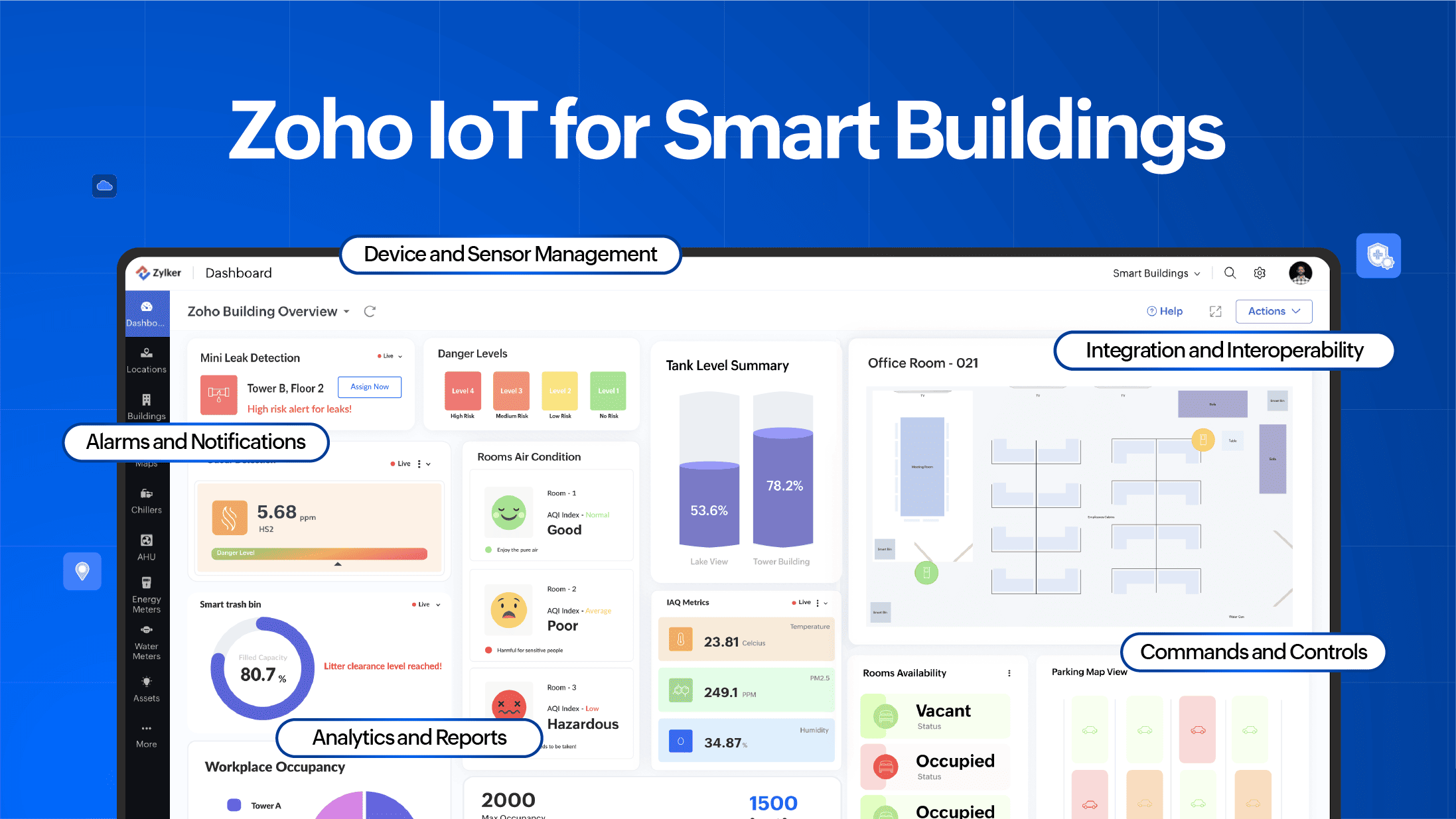 Zoho IoT provides a low-code IoT platform that lets you build solutions based on your buildings requirements, such as: