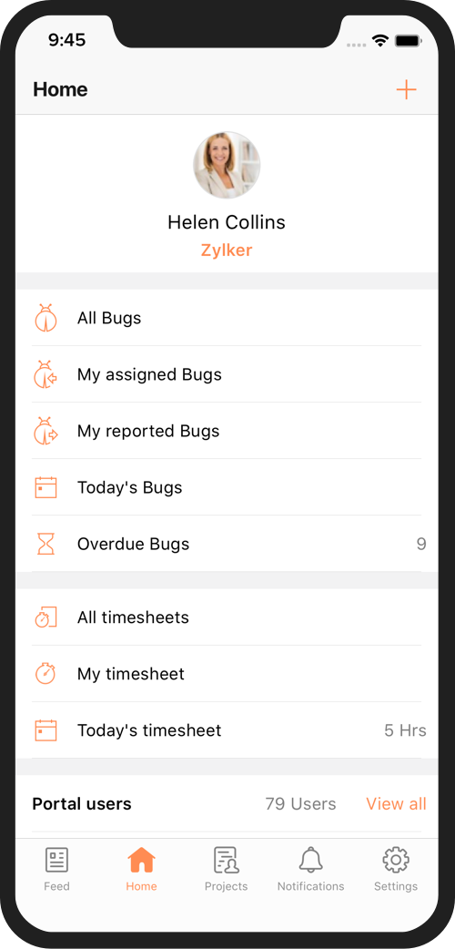 ホームページには、自身に割り当てられたバグや期限切れのバグ、タイムシートの入力など、必要なものすべてが揃っていて、かんたんにアクセスできます。ホームページから、バグのクローズや作業時間の記録、タイムシート入力の承認または拒否ができます。すべて、1クリックだけで実行できます。