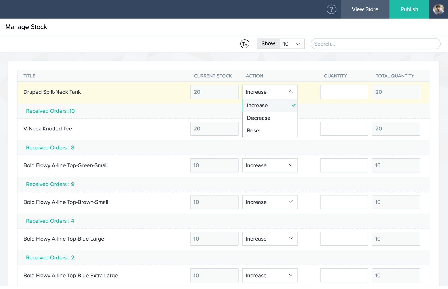 在庫追跡を可能にし、それぞれの注文に応じて在庫レベルを自動的に調整できます。各商品とそのバリエーションの在庫数が記載された商品リストも表示できます。必要に応じて、現在の在庫数を反映するよう、在庫レベルを手動で増減できます。