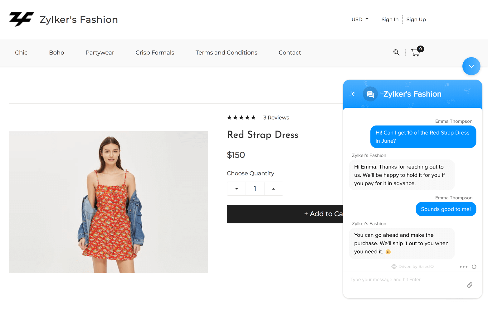 SalesIQ連携により、リアルタイムのストア情報やお客さまひとりひとりに合わせたチャットで、カスタマーサポートを自動化します。チャットボットがよくある質問に回答し、AIが解決できない場合に担当者による対応へとお客さまを誘導します。
