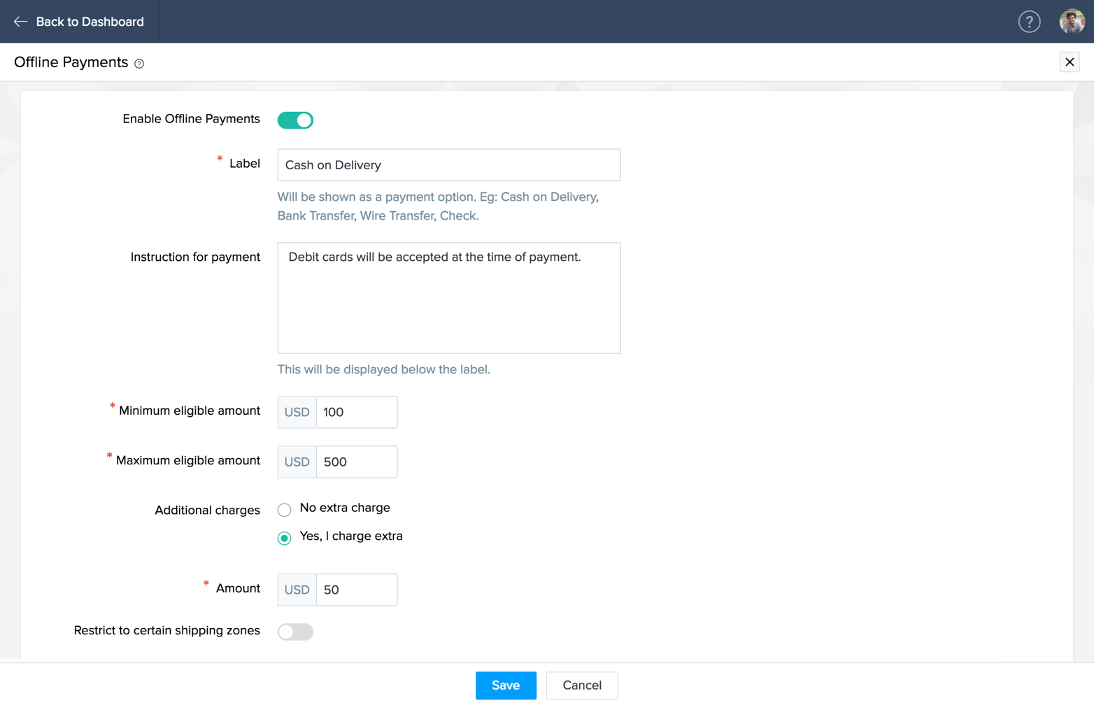 ストアを介して、オフライン決済に対応できます。支払いを受け取ると、注文ページで決済ステータスを更新できます。「代金引換」決済オプションの最小注文価格と最大注文価格も設定できます。